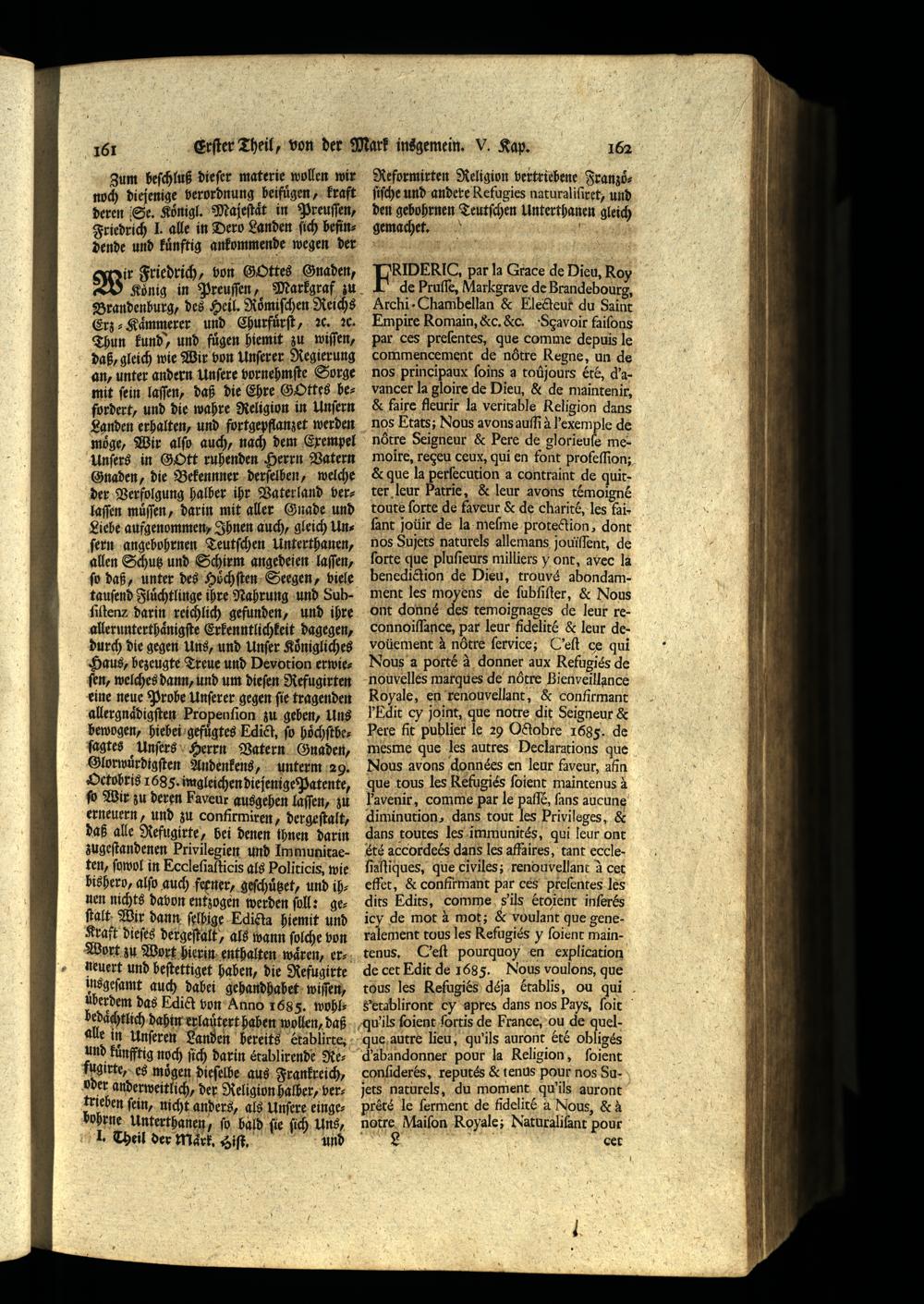 Fin har la Grace de Dieu, Roy de Pruſſe, Markgrave de Brandebourg, Archi- Chamhbellan& Electeuf du Saint Empire Romain,&c. Sc. Sgavoir faiſons Par ces preſentes, que comme depuis le commencement de nötre Regne, un de nos principaux ſoins a toujours Ete, d’avancer la gloire de Dien,& de maintenir, & faire fleurir la veritable Religion dans nos Etats; Nous avons auſſi à exemple de nötre Seigneur& Pere de glorieuſe memoire, regeu ceux, qui en font profeſſion:; & que la perſecution a contraint de quitter leur Fatrie,& leur avons tẽmoigne toute(orte de fayeur& de charitè, les fai.
