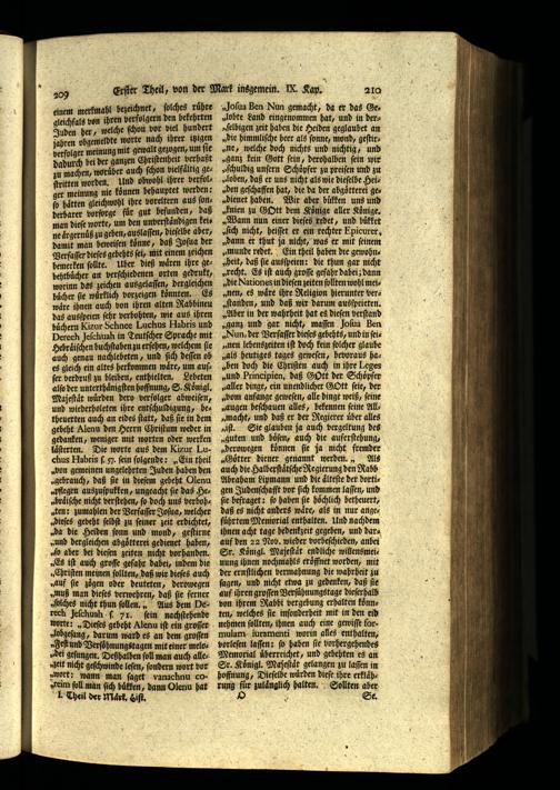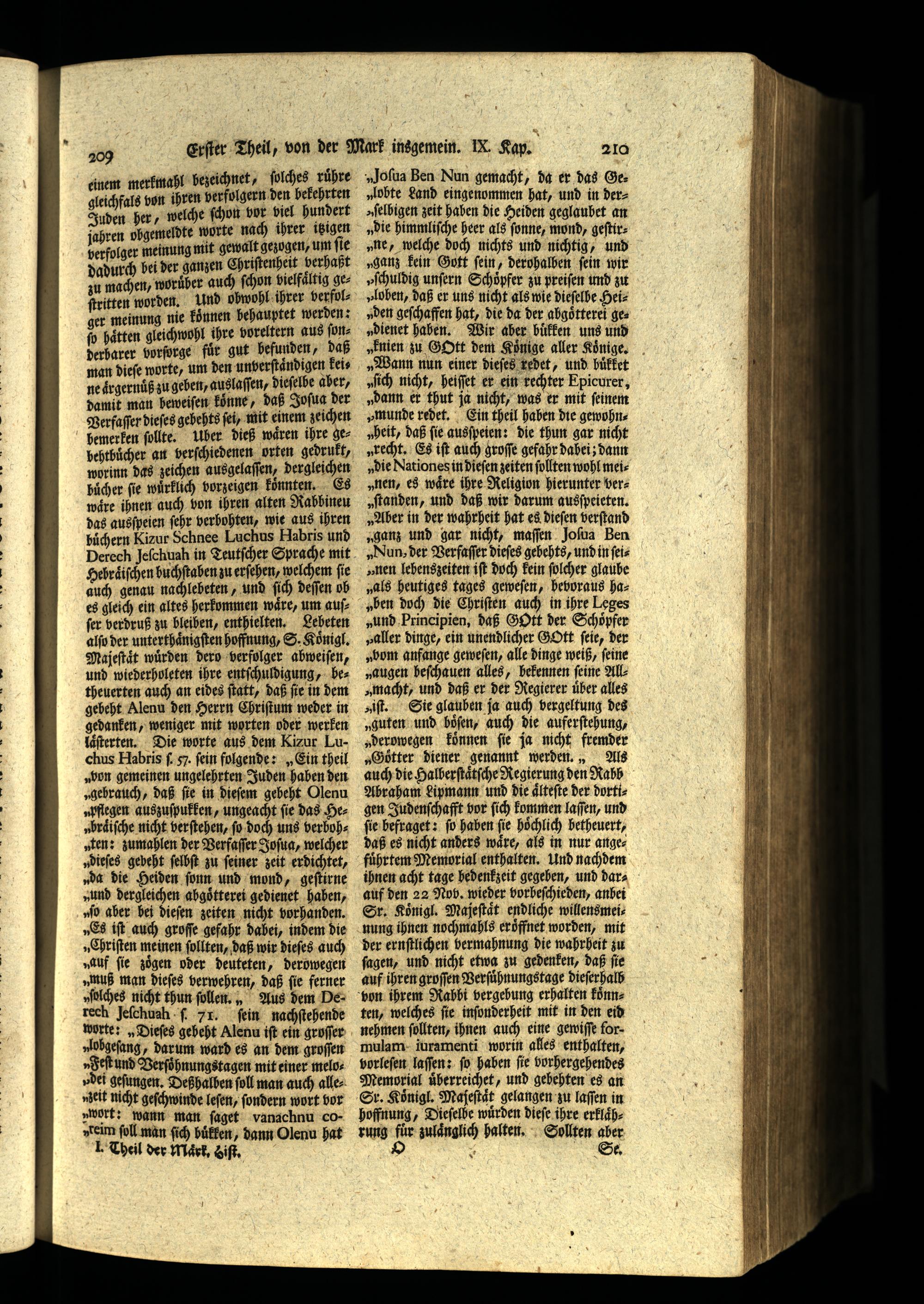 „Sich nicht, heiſſet er ein rechter Epicurer, „dann er thut ja nicht, was er mit ſeinem „munde redet. Ein theil haben die gewohnyheit, daß ſie ausſpeien: die thun gar nicht „recht. Es iſt auch groſſe gefahr dabei; dann „die Nationes in dieſen zeiten ſollten wohl meinen, es wäre ihre Religion hierunter ver„fanden, und daß wir darum ausſpeieten. „Aber in der wahrheit hat es dieſen verſtand „ganz und gar nicht, maſſen Joſua Ben „Nun, der Verfaſſer dieſes gebehts, und in ſei„nen lebenszeiten iſt doch kein ſolcher glaube „als heutiges tages geweſen, hevoraus ha„ben doch die Chriſten auch in ihre Leges „und Principien, daß G9Ott der Schöpfer „aller dinge, ein unendlicher GOtt ſeie, der „Dont anfange geweſen, alle dinge weiß, feine „augen beſchauen alles, bekennen feine All„macht, und daß er der Regierer uͤber alles iſt. Sie glauben ja auch vergeltung des „guten und boͤſen, auch die auferſtehung, „derowegen koͤnnen fie ja nicht fremder „Goͤtter diener genannt werden., Als auch die Halberſtaͤtſche Regierung den Rabb Abraham Lipmann und die aͤlteſte der dortigen Judenſchafft vor ſich kommen laſſen, und ſie befraget: ſo haben ſie hoͤchlich betheuert, daß es nicht anders waͤre, als in nur angefuͤhrtem Memorial enthalten. Und nachdem ihnen acht tage hedenkzeit gegeben, und darauf den 22 Nov, wieder vorbeſchieden, anbei Sr. Königl. Majeſtaͤt endliche willensmeinung ihnen nochmahls eröffnet worden, mit der ernſtlichen bermahnung die wahrheit zu ſagen, und nicht etwa zu gedenken, daß ſie auf ihren groſſen Verſuͤhnungstage dieſerhalb