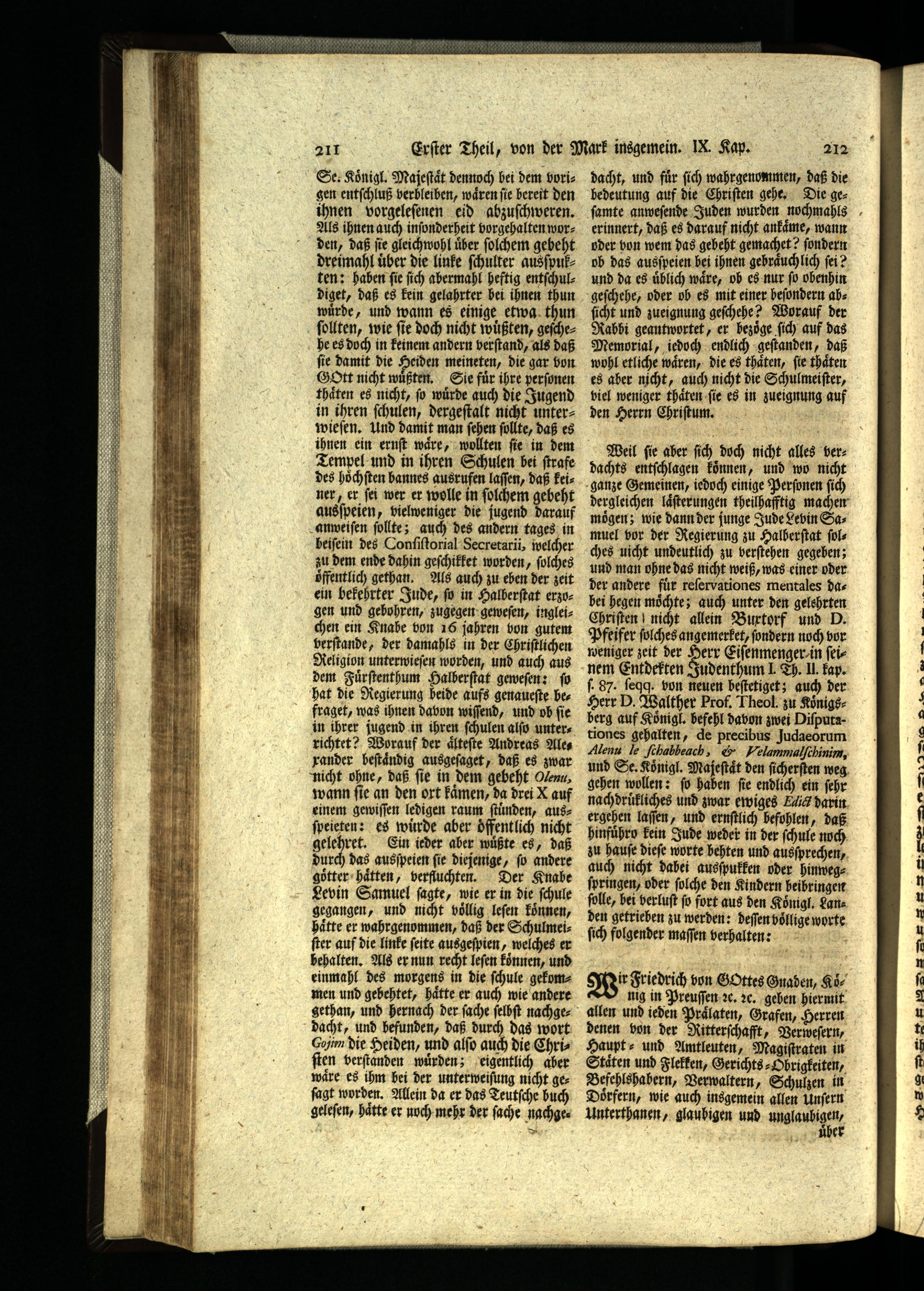 Se. Koͤnigl. Majeſtaͤt dennoch bei dem vorigen entſchluß verbleiben, waͤren ſie bereit den ihnen vorgeleſenen eid abzuſchweren. Als ihnen auch inſonderheit vorgehalten worden, daß ſie gleichwohl uͤber ſolchem gebeht dreimahl über die linke ſchulter ausſpukten: haben ſie ſich abermahl heftig entſchuldiget, daß es kein gelahrter bei ihnen thun wuͤrde, und wann es einige etwa thun ſollten, wie ſie doch nicht wußten, geſchehe es doch in keinem andern berſtand, als daß ſie damit die Heiden meineten, die gar von Gott nicht wuͤßten. Sie für ihre perſonen trhaͤten es nicht, fo wuͤrde auch die Jugend in ihren ſchulen, dergeſtalt nicht unterwieſen. Und damit man ſehen ſollte, daß es ihnen ein ernſt waͤre, wollten ſie in dem Tempel und in ihren Schulen bei ſtrafe des hoͤchſten hannes ausrufen laſſen, daß keiner, er ſei wer er wolle in ſolchem gebeht ausſpeien, vielweniger die jugend darauf anweiſen ſollte; auch des andern tages in beiſein des Conſiſtorial Secretarii, welcher zu dem ende dahin geſchikket worden, ſolches oͤffentlich gethan. Als auch zu eben der zeit ein bekehrter Jude, ſo in Halberſtat erzogen und gebohren, zugegen geweſen, ingleichen ein Knabe von 16 jahren bon gutem berſtande, der damahls in der Chriſtlichen Religion unterwieſen worden, und auch aus dem Fuͤrſtenthum Halberſtat geweſen: fo hat die Regierung beide aufs genaueſte befraget, was ihnen davon wiſſend, und ob ſie