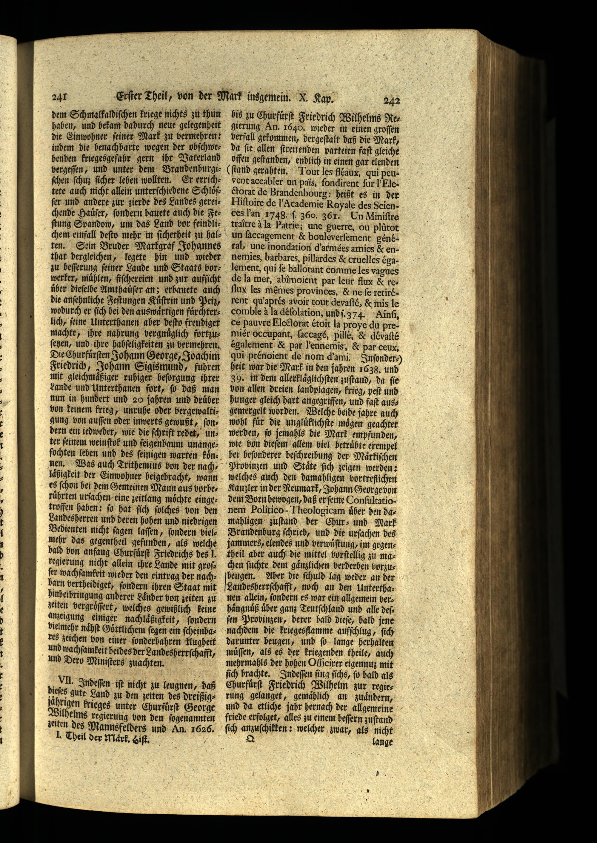 bis zu Churfuͤrſt Friedrich Wilhelms Ne gierung An. 1640. wieder in einen groſſen berfall gekommen, dergeſtalt daß die Mark, da fie allen ſtrettenden parteien faſt gleiche offen geſtanden, endlich in einen gar elenden (ſtand gerahten. Tout les fleaux, qui peuVent accahler un pais, fondirent fur J EleEtorat de Brandenbourg: heißt es in der Hiſtoire de hacademie Royale des Sciences an 1748. ſ 360. 36. Un Miniſtre traſtre à la Patrie une guerre, ou plutot