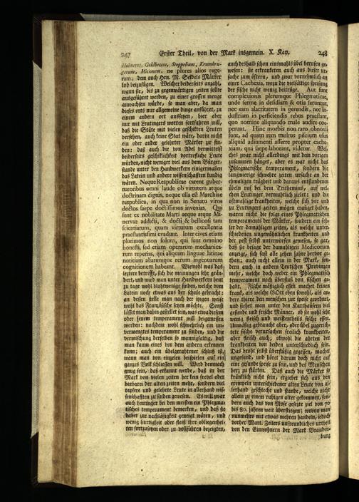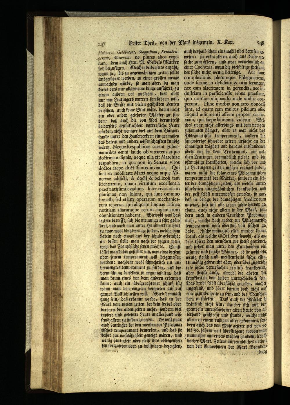 dieſes orts nur allgemeine dinge anfuͤhret, zu einem andern ort ausſetzen, hier aher nur mit Leutingers worten fortfahren will, daß die Staͤte mit vielen geſchikten Leuten verſehen, auch keine Stat waͤre, darin nicht ein oder ander gelehrter Maͤrker zu finden: daß auch die von Adel vermittelſt beiderſeits geſchiklichkeit vortrefliche Leute würden, nicht weniger viel aus dem Buͤrgerſtande unter den Handwerkern einigermaßen das Latein und andere wiſſenſchafften kundig waͤren. Neque kespublicae carent gubernatoribus omni laude ob virtutem atque doctrinam dignis, neque ulla eſt Marchiae respublica, in qua non in Senatu viros doctos ſaepe doctiſſimos invenias, Qui ſant ex nohilitate Marti aeque atque Minervas addicti,&́ docti& bellicoi tam ſcientiarum, quam virtutum excellentia praeſtantisſimi evadunt. Inter cives etiam plurimos non ſolum, qui ſunt omnino honeſti, ſed etiam operarum mechanicarum reperias, qui aliquam linguae latinae notitiam aliarumque rerum ingenuarum cognitionem habeant. Wiewohl was das leztere betrifft, ſich die meinungen ſehr geaͤndert, und wird man unter Handwerkern heut zu tage wohl bluhtwenige finden, welche hom Latein noch etwas aus der ſchule gebracht: an deſſen ſtelle man nach der itzigen weiſe wohl das Franzoͤſiſche ſetzen mͤchte, Sonſt laͤſſet man dahin geſtellet ſein, was etwa dieſem oder jenem temperament will beigemeſſen werden: nachdem wohl ſchwehrlich ein unvermengtes temperament zu finden, und die bermiſchung derſelben ſo mannigfaltig, daß man kaum eines vor dem andern erkennen kann; auch ein uͤbelgerahtener ſchluß iſt, wann man von einzelen beiſpielen auf ein ganzes Volk ſchlieſſen will. Wird demnach gnug ſein, daß erkannt werde, daß in der Mark von vielen zeiten her kein frevel oder barharei der alten zeiten mehr, ſondern viel tapfere und gelehrte Leute in allerhand wiſſenſchafften zu finden geweſen. Es will zwar auch Leutinger hei den meiſten ein Phlegma