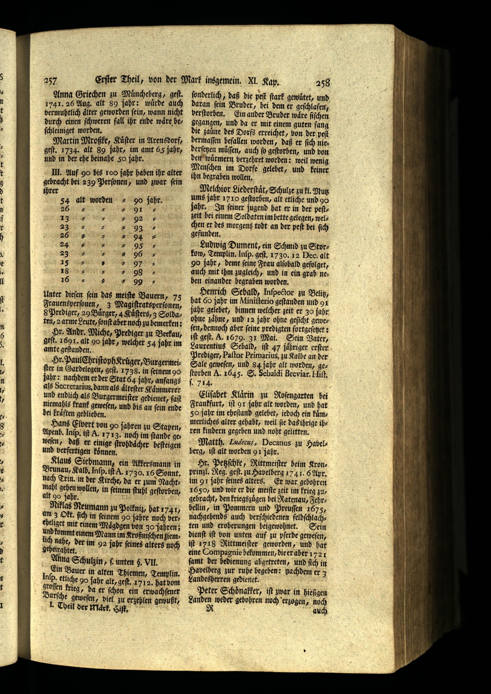 geſt. 1734. alt 89 jahr, im amt 65 jahr, und in der ehe beinahe 50 jahr. Ill. Auf 90 bis roo jahr haben ihr alter gebracht hei 239 Perſonen, und zwar fein ihrer BT/) 54 alt worden 6