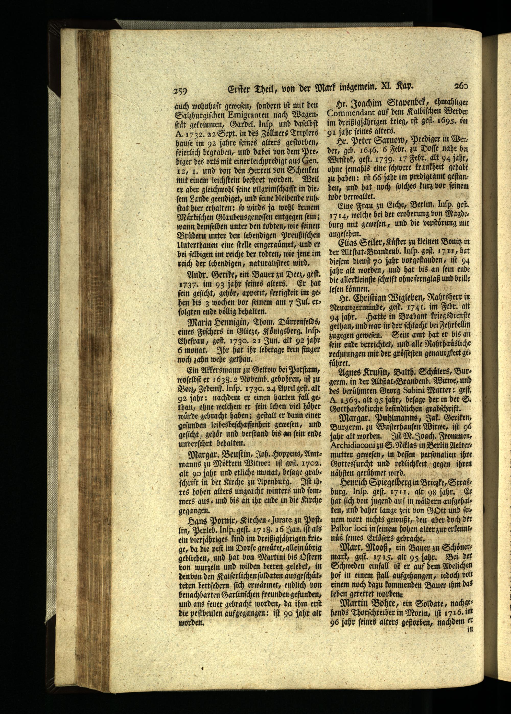 259 auch wohnhaft geweſen, ſondern iſt mit den Salzburgiſchen Emigranten nach Wagenſtaͤt gekommen, Gardel. Inſp und daſelbſt A. 1732. 22 Sept. in des Zöͤllners Triplers hauſe im 92 jahre ſeines alters geſtorben, feierlich begraben, und dabei won dem Prediger des orts mit einer leichpredigt aus Gen. 12, J. und von den Herren von Schenken mit einem leichſtein beehret worden. Weil er aber gleichwohl ſeine pilgrimſchafft in dieſem Lande geendiget, und ſeine bleibende ruhſtat hier erhalten: ſo wirds ja wohl keinem Maͤrkiſchen Glaubensgenoſſen entgegen ſein; wann demſelben unter den todten, wie ſeinen Brüdern unter den lebendigen Preußiſchen Unterthanen eine ſtelle eingerauͤmet, und er bei ſelbigen im reiche der todten, wie jene im reich der lebendigen, naturaliſiret wird.
