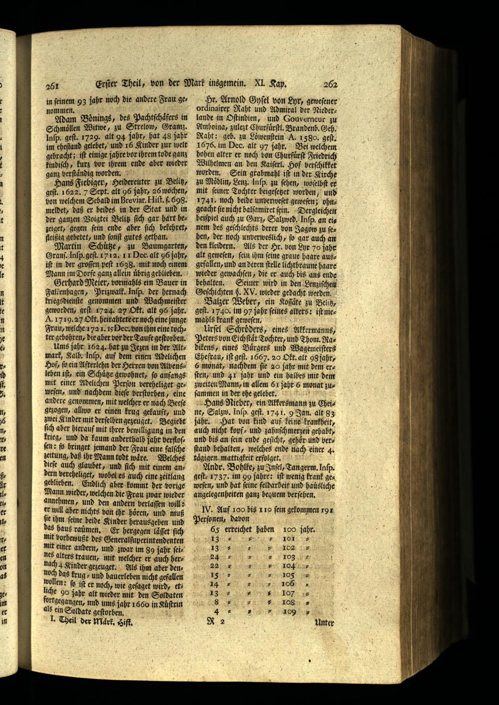 im eheſtand gelebet, und 16 Kinder zur welt 2 iſt einige jahre vor ihrem tode ganz findiſch, kurz vor ihrem ende aber wieder ganz verſtaͤndig worden. ä. Hans Fiebiger, Heidereuter zu Belitz, geſt. 1622. 7 Sept. alt 96 jahr, 26 wochen, bon welchem Sehald im Breviar. Hiſt. f 698, meldet, daß er beides in der Stat und in der ganzen Voigtei Belitz ſich gar hart bezeiget, gegen ſein ende aber ſich hekehret, fleißig gebetet, und ſonſt gutes gethan. Martin Schutze, zu Baumgarten, Granſ. Inſp. geſt. 1712. 11 Dec. alt 96 jahr, iſt in der groſſen peſt 1638. mit noch einem Mann im Dorfe ganz allein übrig geblieben, Gerhard Meier, wormahls ein Bauer in Falkenhagen, Prizwalk. Inſp. der hernach kriegsdienſte genommen und Wach meiſter geworden, geſt 1724. 27 Okt. alt 96 jahr. A. 1719.27 Oft, heirahtete er noch eine junge Frau, welche 1721. 15 Dec; bon ihm eine tuchter gebohren, die aber vor der Taufe geſtorben. Ums jahr 1624. hat zu Jezen in der Altmark, Kalb. Inſp. auf dem einen Adelichen Hof, ſo ein Afterlehn der Herren von Alvens