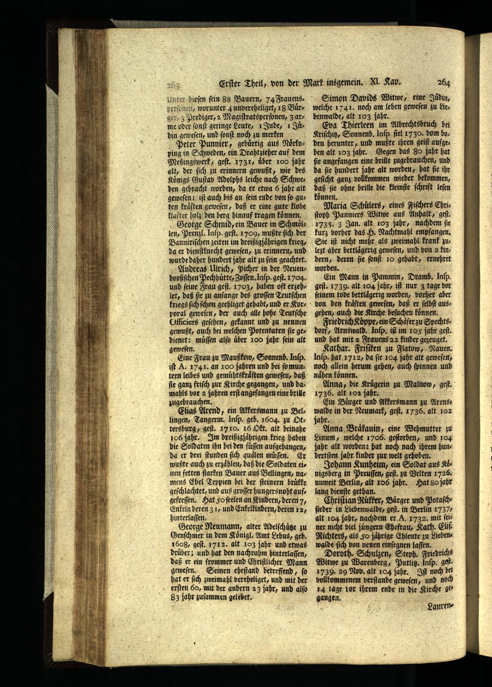 Simon Davids Witwe, eine Juͤdin, welche 1741. noch am leben geweſen zu Lie benwalde, alt 103 jahr. A Eva Thierleen im Albrechtsbruch bei Kriſchitz, Sonnenb. Inſp fiel 1730. vom boden herunter, und mußte ihren geiſt aufgeben alt 103 jahr. Gegen das So jahr hat ſie angefangen eine brille zugebrauchen, und da ſie hundert jahr alt worden, hat ſie ihr geſicht ganz vollkommen wieder bekommen, daß ſie ohne brille die kleinſte ſchrift leſen können..