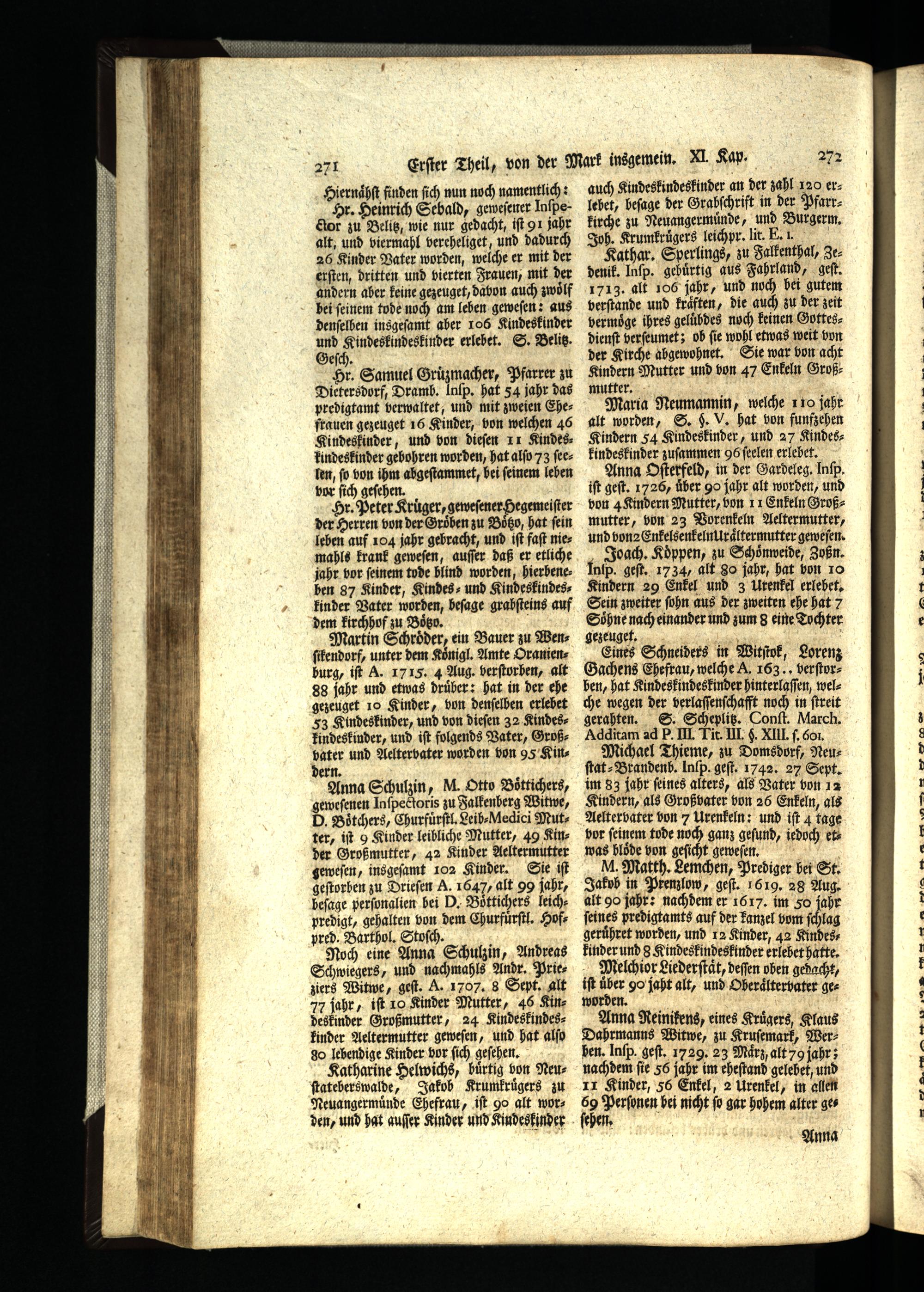 Martin Schroͤder, ein Bauer zu Wenſikendorf, unter dem Koͤnigl. Amte Oranienburg, iſt A. 1715. 4 Aug. verſtorben, alt 88 jahr und etwas drüber: hat in der ehe gezeuget 10 Kinder, von denſelben erlebet 53 Kindeskinder, und von dieſen 32 Kindeskindeskinder, und iſt folgends Vater, Großbater und Aeltervater worden von 95 Kindern. geweſenen Inſpectoris zu Falkenberg Witwe, P. Boͤtchers, Churfuͤrſtl. Leib⸗Medici Mutter, iſt 9 Kinder leibliche Mutter, 49 Kinder Großmutter, 42 Kinder Aeltermutter geweſen, ins geſamt 102 Kinder. Sie iſt geſtorben zu Drieſen A. 1647, alt 99 jahr, heſage perſonalien bei D. Böttichers leichpredigt, gehalten von dem Churfuͤrſtl. Hofpred. Barthol. Stoſch.