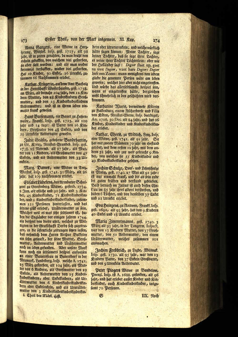 Eliſabet Lidekens, des Arendator Schul zens zu Greifenberg Witwe, geſtorb. 1734. 8 Jun. alt etliche und 9o jahr, und 3 Kinder, 45 Kindeskinder, 71 Kindeskindeskinder, und 2 Kindeskindeskindeskinder, zuſammen 121 Perſonen hinterlaſſen, und das ſeltene gluͤk erlebet, Uraͤltermutter zu fein, Welches weil es was ſehr ſeltſames iſt, haben die Englaͤnder vor einigen jahren 1744. ein beiſpiel von dieſer ahrt, welches zu Wittigton in der Grafſchafft Derby ſich zugetragen, in die öffentliche zeitungen ſetzen laſſen, daß nehmlich dem Herrn Arthur Bukkeley ein ſohn getauft, der feine Mutter, Großmutter, Aeltermutter und Uraͤltermutter noch im leben gefunden. Aber unſere Mark kann noch ein ſeltſamers beiſpiel aufweiſen an einer Bauersfrau in Baiersdorf in der Neumark, Landsberg. Inſp. welche A. 1741. 25 März geſtorben, alt 104 jahr, als Mutter von 6 Kindern, als Großmutter von 29 Enkeln, als Aeltermutter bon 25 Kindes: lindeskindern, oder Enkelkindern, als Urältermutter bon 6 Kindeskindeskindeskindern oder Enkelenkeln, und als Ururaͤltermutter von 3 Kindeskindeskindeskindeskin