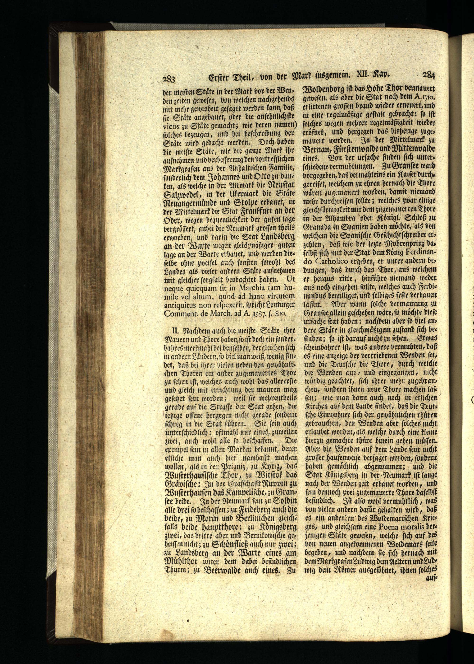 der meiſten Staͤte in der Mark bor der Wenden zeiten geweſen, von welchen nachgehends mit mehr gewisheit geſaget werden kann, daß fie, Staͤte angebauet, oder die anſehnlichſte vicos zu Staͤte gemacht; wie deren namen) ſolches bezeugen, und bei beſchreibung der Stäte wird gedacht werden. Doch haben die meiſte Staͤte, wie die ganze Mark ihr aufnehmen und verbeſſerung den vortrefflichen Markgrafen aus der Anhaltiſchen Familie, ſonderlich dem Johannes und Otto zu danken, als welche in der Altmark die Neuſtat Salzwedel, in der Ukermark die Staͤte Neuangermuͤnde und Stolpe erbauet, in der Mittelmark die Stat Frankfurt an der Oder, wegen bequemlichkeit der guten lage vergroöͤſſert, anbei die Neumark groſſen theils erworben, und darin die Stat Landsberg an der Warte wegen gleichmaͤßiger guten lage an der Warte erbauet, und werden dieſelbe ohne zweifel auch ſonſten ſowohl des Landes als bieler andern Staͤte aufnehmen mit gleicher ſorgfalt beobachtet haben. Ut neque quicquam fit in Marchia tam humile vel altum, quod ad hanc virtutem antiquitus non reſpexetit, ſpricht Leutinger Comment. de March. ad A. 1587. ſ. 810.