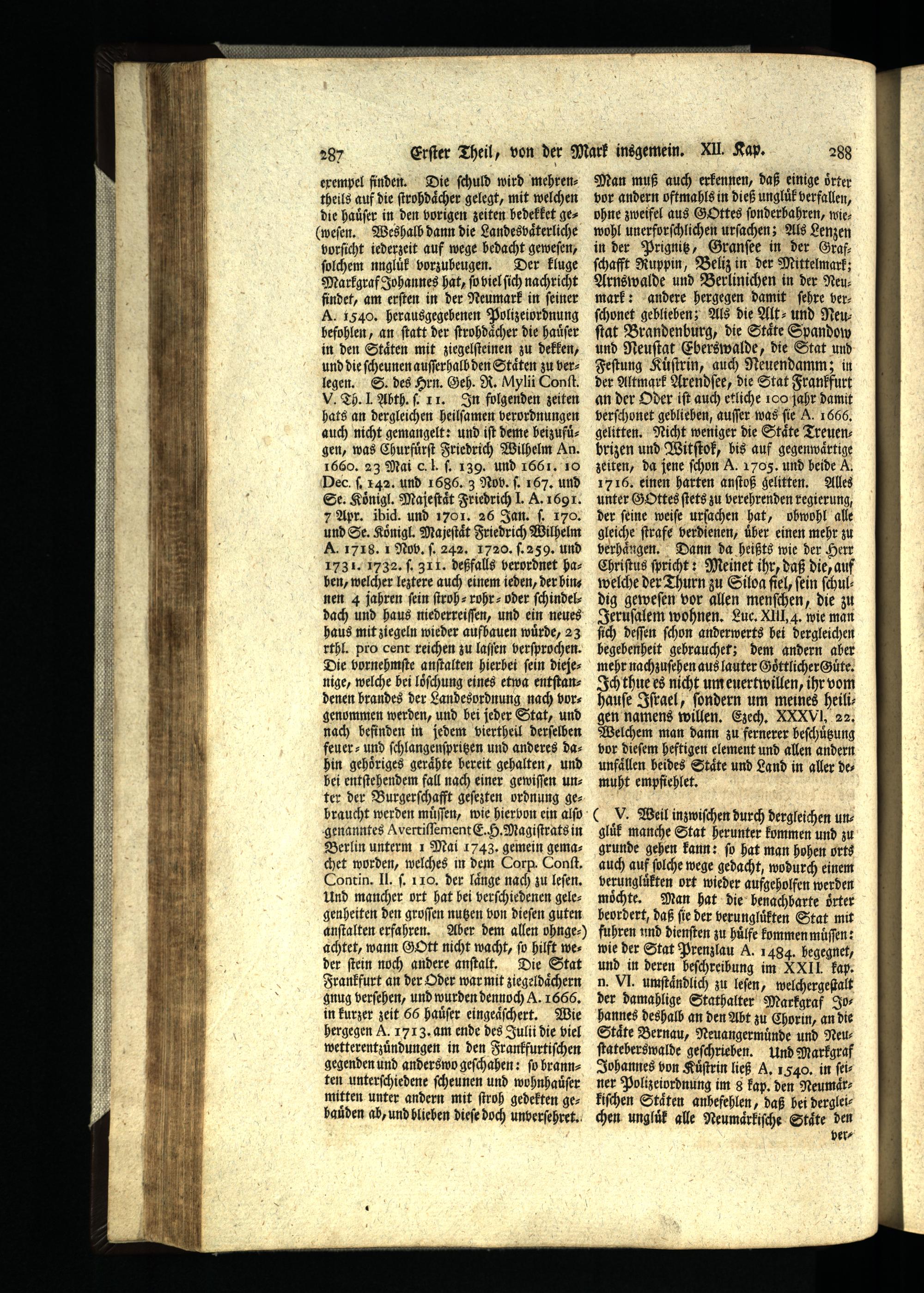 vorſicht iederzeit auf wege bedacht geweſen, ſolchem ungluͤk vorzubeugen. Der kluge Markgraf Johanne hat, ſo viel ſich nachricht findet, am erſten in der Neumark in feiner A. 1540. herausgegebenen Polizeiordnung befohlen, an ſtatt der ſtrohdaͤcher die hauͤſer in den Staͤten mit ziegelſteinen zu dekken, und die ſcheunen auſſerhalb den Staͤten zu verlegen. S. des Hrn. Geh. R. Mylii Conſt. V. Th. J. Abth. ſ. 11. In folgenden zeiten hats an dergleichen heilſamen berordnungen auch nicht gemangelt: und iſt deme beizufuͤgen, was Churfuͤrſt Friedrich Wilhelm An. 1660. 23 Mai C. L. ſ. 139. und 1661. 10 Dec. ſ. E42. und 1686. 3 Nov. ſ. 167. und Se. Koͤnigl. Majeſtaͤt Friedrich J. A. 1691. 7 Apr. ibid. und 1701. 26 Jan. ſ. 170. und Se. Koͤnigl. Majeſtaͤt Friedrich Wilhelm A. 1718. 1 Nob. ſ. 242. 1720. ſ. 259. und 1731. 1732. ſ. 311. deßfalls verordnet haben, welcher leztere auch einem ieden, der hinnen 4 jahren fein ſtroh⸗ rohr⸗ oder ſchindeldach und haus niederreiſſen, und ein neues haus mit ziegeln wieder aufbauen wuͤrde, 23 rthl. pro cent reichen zu laſſen verſprochen. Die vornehmſte anſtalten hierbei ſein diejenige, welche bei loͤſchung eines etwa entſtandenen brandes der Landesordnung nach vorgenommen werden, und bei jeder Stat, und nach befinden in jedem viertheil derſelben feuer⸗ und ſchlangenſpritzen und anderes dahin gehoͤriges geraͤhte bereit gehalten, und bei entſtehendem fall nach einer gewiſſen unter der Burgerſchafft geſezten ordnung gebraucht werden muͤſſen, wie hierbon ein alſo genanntes Avertiſſement E. H. Magiſtrats in Berlin unterm Mai 1743. gemein gemachet worden, welches in dem Corp. Conſt. Contin. Il. ſ. 110. der laͤnge nach zu leſen. Und mancher ort hat bei verſchie denen gelegenheiten den groſſen nutzen von dieſen guten anſtalten erfahren. Aber dem allen ohnge⸗) achtet, wann GOtt nicht wacht, fo hilft weder ſtein noch andere anſtalt. Die Stat Frankfurt an der Oder war mit ziegeldaͤchern gnug verſehen, und wurden dennoch A. 1666. in kurzer zeit 66 hauͤſer eingeaͤſchert. Wie hergegen A. 1713. am ende des Julii die viel wetterentzuͤndungen in den Frankfurtiſchen gegenden und anderswo geſchahen: ſo brannten unterſchiedene ſcheunen und wohnhauͤſer mitten unter andern mit ſtroh gedekten gehauüden ab, und blieben dieſe doch unberſehret.