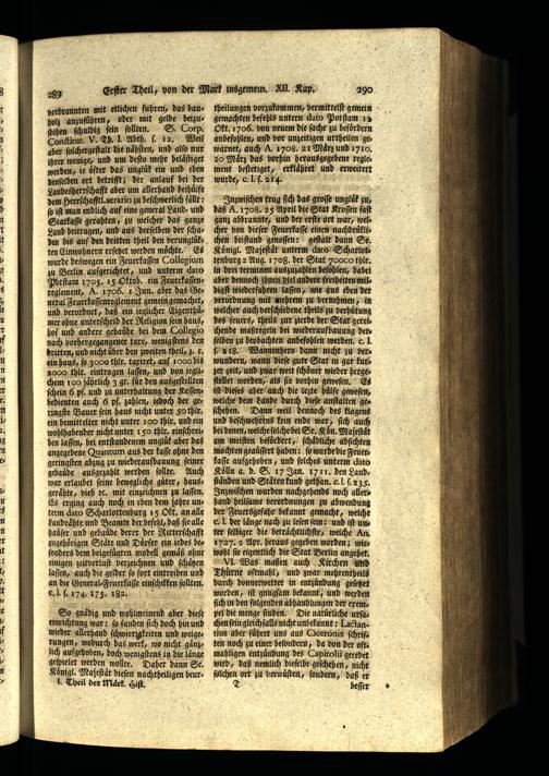 ſtellet worden, als ſie vorhin geweſen. Es iſt dieſes aber auch die lezte huͤlfe geweſen, welche dem Lande durch dieſe anſtalten geſchehen. Dann weil dennoch des klagens und beſchwehrens kein ende war, ſich auch bei denen, welche ſolche bei Sr. Köͤn. Majeſtaͤt am meiſten befördert, ſchaͤdliche abſichten mochten geaůſſert haben: ſo wurde die Feuer, kaſſe aufgehoben, und ſolches unterm dato Kölln a. d. S. 17 Jan. 1711. den Landſtaͤnden und Staͤten kund gethan. c. l. ſ. 235. Inzwiſchen wurden nachgehends noch allerhand heilſame verordnungen zu abwendung der Feuersgefahr bekannt gemacht, welche c. l der laͤnge nach zu leſen fein: und iſt unter ſelbiger die betraͤchtlichſte, welche An. 1727. 2 Apr. heraus gegeben worden; wiewohl fie eigentlich die Stat Berlin angehet.