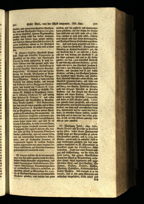 Kindern; auf den uͤbrigen von Markgraf Kaſimir und ſeinen Kindern. Reineccius zehlet es unter die Maͤrkiſche Compendia, und ſtellet es Juſti ſchriften gleich. Cernitius gedenket ſeiner gleichfalls, und erinnert hin und wieder, was bei ihm ausgeſetzet koͤnnte werden: wie dann auch unterſchiedene dinge ſein, inſonderheit auf der lezten ſeite des 2. blats, ſo verheſſert koͤnnen werden, welches ihm doch, weil er einer von den erſten geweſen, ſo ſich an dieſe Hiſtorie gemacht, deſto eher zu gute zuhalten.; ly. Wolfgang Jobſt, oder zußus, Medic. Doctor und Profeſſſr zu Frankfurt an der Oder, deſſen Vater Hieronymus Jobſt lange zeit Burgermeiſter zu gedachtem Frankfurt geweſen, und A. 1539. verſtorben, wovon noch ein andenken nebſt einem kunſtreichen gemaͤhlde bon dem unge: rechten haußhalter in S. Marienkirche zu Frankfurt gegen der Profeſſorum ſtuͤhle verhanden. Dieſer hat einen Kurzen auszug und beſchreibung, wie die worte des titels lauten, des ganzen Churfürſtenthums der Mark zu Brandenburg aufgeſetzet ſampt ihren ingeleipten und zugehörenden Graf⸗ und Herrſchaften, 5: ſtumen, Stiften, Staͤten, Flelken, Markten, Schloͤſſern, Kloͤſtern und flieſſenden Waſſern. Und bezeuget er in der vorrede, daß es ihm ganz ſchwerlich und muͤheſam vorgefallen, ſolche arbeit und
