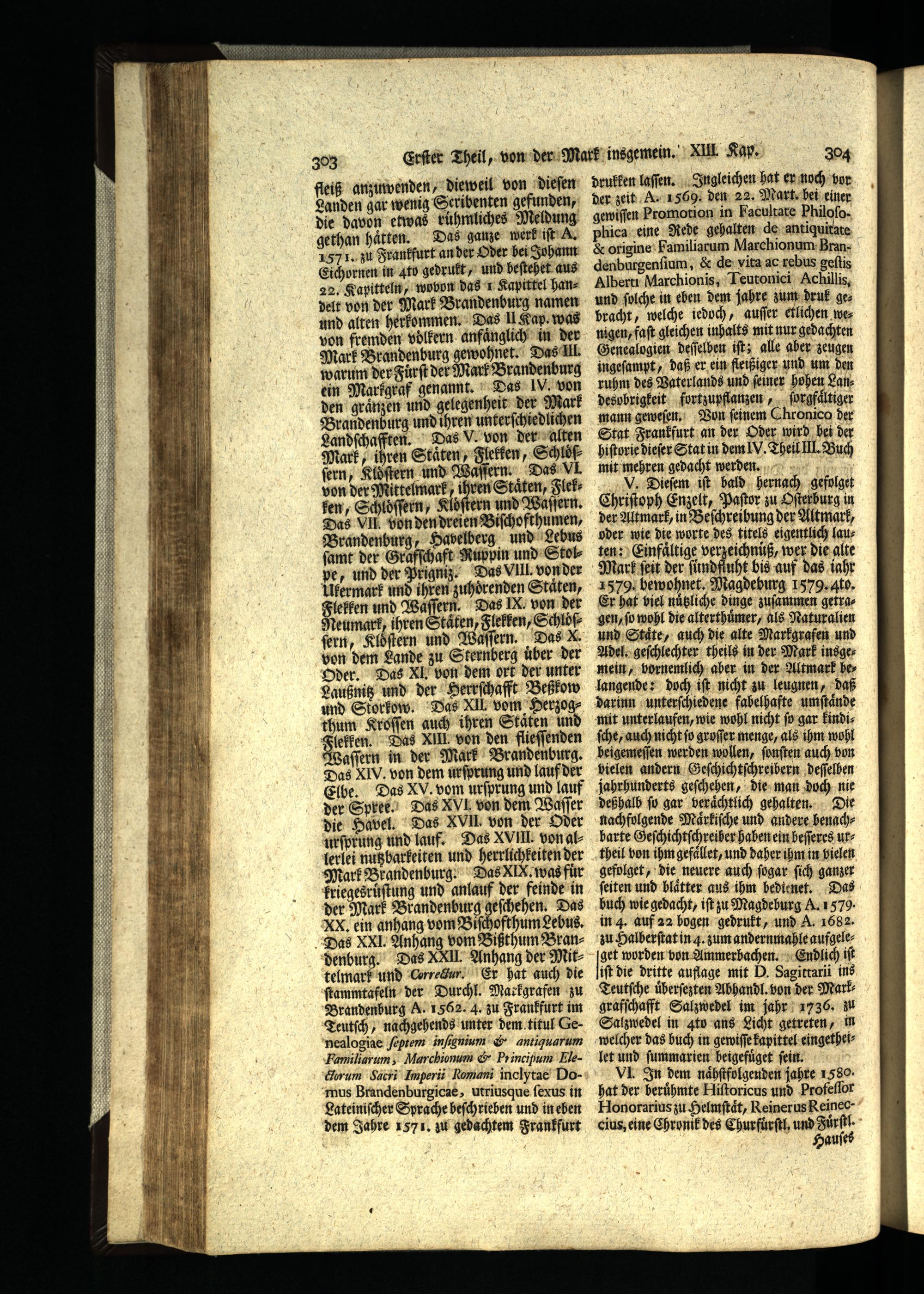 fleiß anzuwenden, dieweil von dieſen Landen gar wenig Seribenten gefunden, die davon etwas rühmliches Meldung gethan haͤtten. Das ganze werk iſt A. 1571. zu Frankfurt an der Oder bei Johann Eichornen in to gedrukt, und beſtehet aus 22. Kapitteln, wovon das 1 Kapitel handelt von der Mark Brandenburg namen und alten herkommen. Das 11 Kap. was von fremden volkern anfänglich in der Mark Brandenburg gewohnet. Das Ill. warum der Fürſt der Mark Brandenburg ein Markgraf genannt. Das IV. von den graͤnzen und gelegenheit der Mark Brandendurg und ihren unterſchiedlichen Landſchafften. Das V von der alten Mark, ihren Staͤten, Fleklen, Schloͤſfern, Klöſtern und Waſſern. Das VL von der Mittelmark i ven Staͤten, Flekken, Schlöſſern, Kloͤſtern und Waſſern. Das Vll. von den dreien Biſchofthumen, Brandenburg, Havelberg und Lebus ſamt der Grafſchaft Ruppin und Stolpe, und der Prigniz. Das Vlll. von der