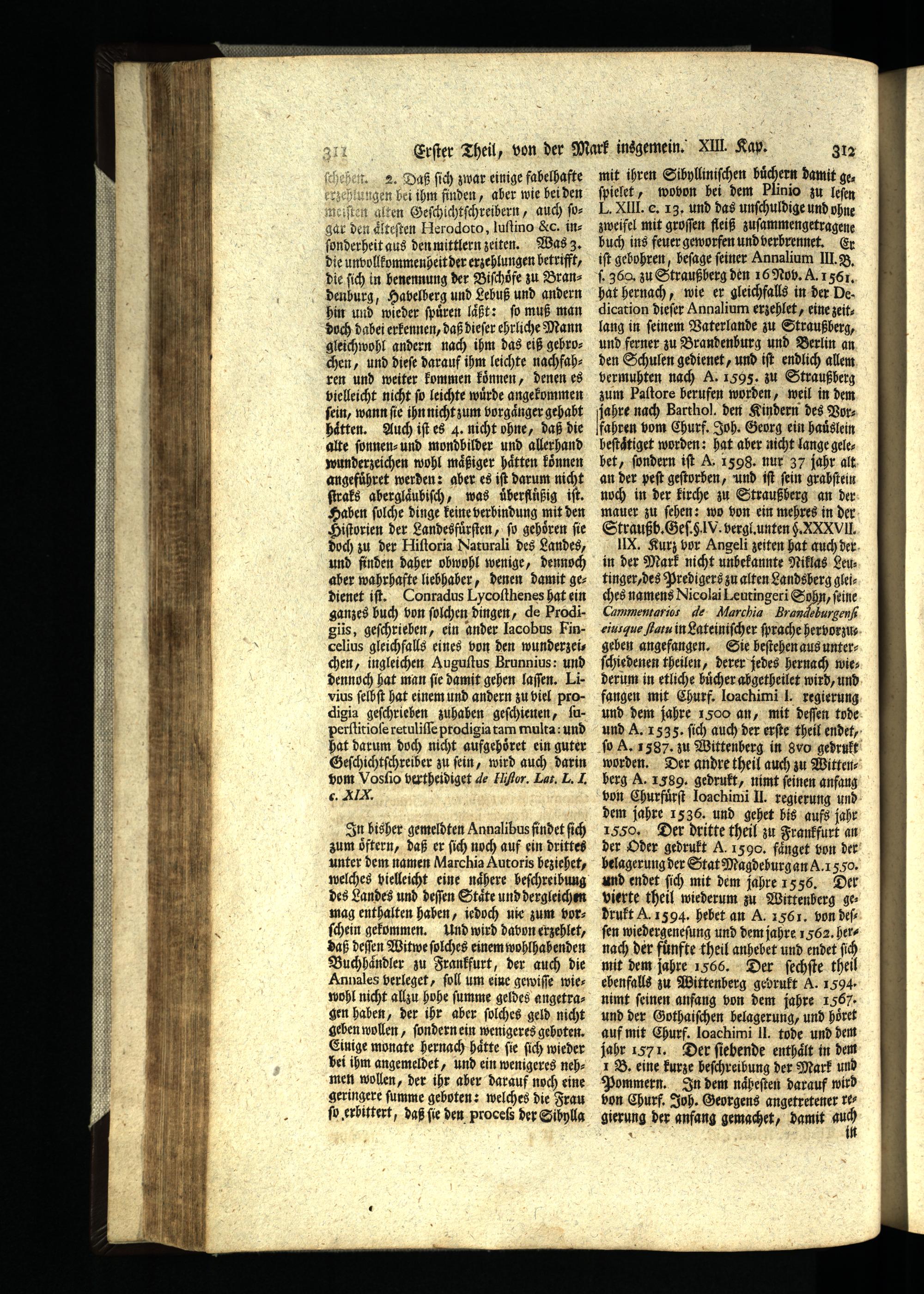fahren vom Churf. Joh. Georg ein hauͤslein beſtaͤtiget worden: hat aber nicht lange gelebet, ſondern iſt. 1598. nur 37 jahr alt an der peſt geſtorhen, und iſt fein grabſtein noch in der kirche zu Straußberg an der mauer zu ſehen: wo von ein mehres in der Straußb. Geſ. 5 V. vergl. unten 5. XXVII. IIx. Kurz bor Angeli zeiten hat auch der in der Mark nicht unbekannte Niklas Leutinger, des Predigers zu alten Landsherg gleiches namens Nicolai Leutingeri Sohn, feine Cammentgrio de Marchid Brandeßurgenſi eius que ſiatu in Lateiniſcher ſprache hervorzugeben angefangen. Sie beſtehen aus unterſchiedenen theilen, derer jedes hernach wiederum in etliche bücher ahgetheilet wird, und fangen mit Churf. loachimi. regierung und dem jahre 1500 an, mit deſſen tode und A. 1535. ſich auch der erſte theil endet, ſo A. 1587. zu Wittenberg in 8vo gedrukt worden. Der andre theil auch zu Wittenberg A. 1989. gedrukt, nimt feinen anfang von Churfuͤrſt loꝛchimi Il. regierung und dem jahre 1536. und gehet bis aufs jahr 1650. Der dritte theil zu Frankfurt an der Oder gedrukt A. 1590. faͤnget bon der belagerung der Stat Magdehurg an A. 1550. und endet ſich mit dem jahre 7555. Der vierte theil wiederum zu Wittenberg gedrukt A. 1594. hebet an A. 1561. von Del ſen wiedergeneſung und dem jahre 1562. hernach der fünfte theil anhebet und endet ſich mit dem jahre 1566. Der ſechſte theil ebenfalls zu Wittenberg gebrukt A. 1594. nimt feinen anfang von dem jahre 1567. und der Gothaiſchen belagerung, und hoͤret auf mit Churf. loachimi II. tode und dem jahr 1571. Der ſiebende enthaͤlt in dem 1B. eine kurze beſchreibung der Mark und Pommern. In dem naͤheſten darauf wird bon Churf. Joh. Georgens angetretener regierung der anfang gemachet, damit ug