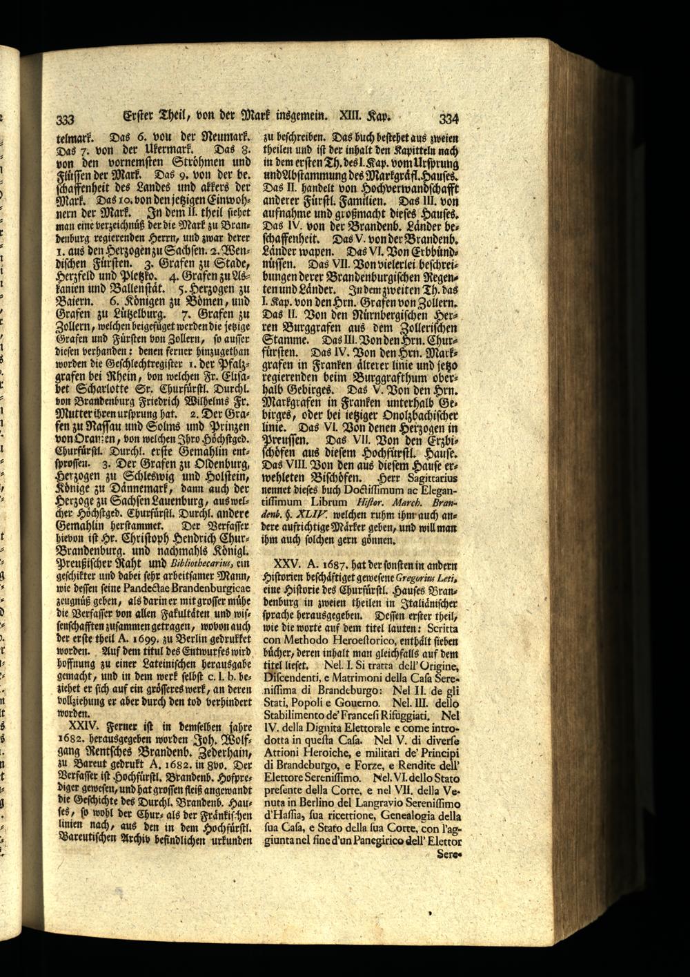 WV. A. 1687. hat der ſonſten in andern Hiſtorien beſchaͤftiget geweſene Gregorius Lei, eine Hiſtorie des Churfuͤrſtl. Hauſes Brandenburg in zweien theilen in Italiaͤniſcher ſprache herausgegeben. Deſſen erſter theil, wie die worte auf dem titel lauten: Scritta con Methodo Heroeſtorico, enthaͤlt ſieben buͤcher, deren inhalt man gleichfalls auf dem titel lieſet. Nel I. Si tratta dell Origine, Diſcendenti, e Matrimoni della Caſa Sereniſſima di Brandeburgo: Nel II. de gli Stati, Popoli e Gouerno. Nel. III. deſſo Stabilimento de Franceſi Rifuggiati. Nel IV. della Dignita Elettorale e come introdotta in queſta Caſa. Nel V. di diverſe Attioni Heroiche, e militari de Principi di Brandeburgo, e Forze, e Rendite dell’ Elettore Sereniſſimo. Nel. VI. dello Stato preſente della Corte, eæ nel VII. della Venuta in Berlino del Langravio Sereniſſimo d Haſſia, ſua ricettione, Genealogia della ſua Caſa, e Stato della ſua Corte, Con Taggiunta nel fine dun Panegirico dell' Elettor