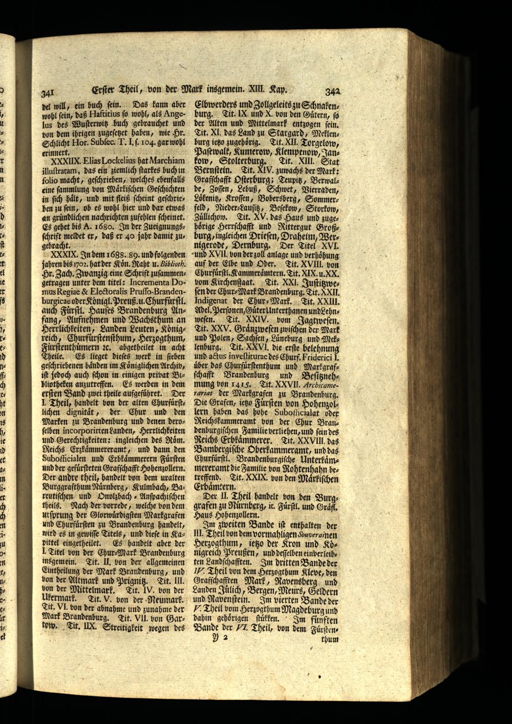 XXXIX. In dem 1688. 89. und folgenden jahren bis 1702, hat der Kon. Raht u. Bibliorh. Br. Zach. Zwanzig eine Schrift zuſammengetragen unter dem titel: Incrementa Domus Regiae& Electoralis Pruſſo Brandenburgicas oder Königl. Preuß. u. Churfuͤrſtl. and Fuͤrſtl. Hauſes Brandenburg Anfang, Aufnehmen und Wachsthum an Herrlichkeiten, Landen Leuten, Königreich, Churfuͤrſtenſthum, Herzogthum, Fuͤrſtenthuͤmern ꝛc. abgetheilet in acht Theile. Es lieget dieſes werk in ſieben geſchriebenen baͤnden im Koͤniglichen Archiv, iſt jedoch auch ſchon in einigen privat Bibliotheken anzutreffen. Es werden in dem erſten Band zwei theile aufgefuͤhret. Der L Theil, handelt von der alten Churfuͤrſtlichen dignitaͤt, der Chur und den Marken zu Brandenburg und denen deroſelben incorporirten Landen, Herrlichkeiten und Gerechtigkeiten: ingleichen des Roͤm. Reichs Erzkaͤmmereramt, und dann den Subofficialen und Erbkaͤmmerern Fuͤrſten und der gefuͤrſteten Grafſchafft Hohenzollern. Der andre theil, handelt von dem uralten Burggrafthum Nuͤrnberg, Kulmbach, Bareutiſchen und Onolzbach⸗Anſpachiſchen