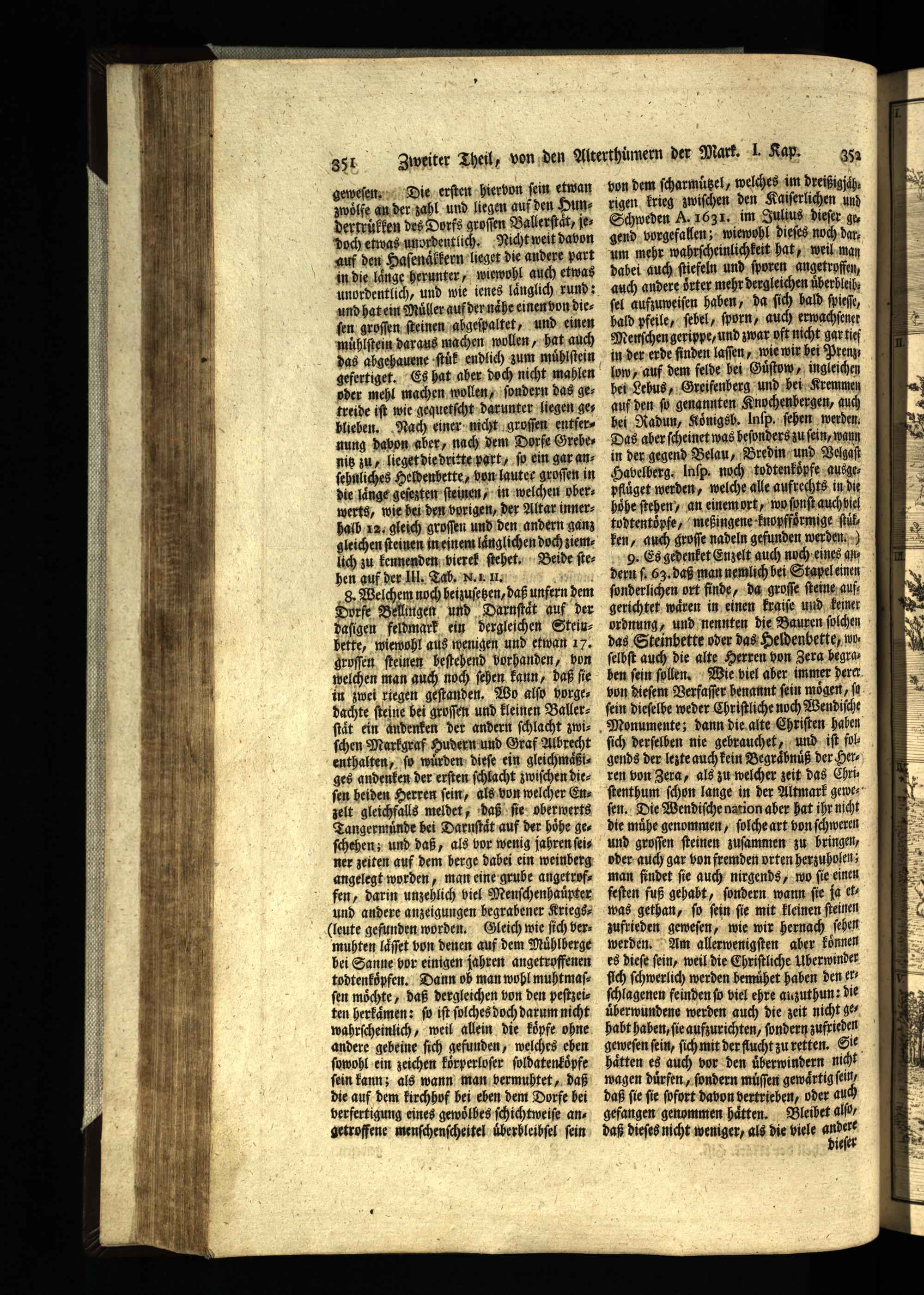 lich zu kennenden viereß ſtehet. Beide fe: hen auf der Ill. Tab. N.. Il. 6 g. Welchem noch heizuſetzen, daß unfern dem Dorfe Bellingen und Darnſtdt auf der daſigen feldmark ein dergleichen Steinbette, wiewohl aus wenigen und etwan 17. groſſen ſteinen heſtehend vorhanden, bon welchen man auch noch ſehen kann, daß fie in zwei riegen geſtanden. Wo alſo borgedachte ſteine bei groſſen und kleinen Ballerſtaͤt ein andenken der andern ſchlacht zwiſchen Markgraf Hudern und Graf Albrecht enthalten, ſo wurden dieſe ein gleichmaͤßges andenken der erſten ſchlacht zwiſchen diefen beiden Herren fein, als von welcher Enzelt gleichfalls meldet, daß ſie oberwerts Tangermuͤnde bei Darnſtaͤt auf der höhe ges ſchchen; und daß, als vor wenig jahren ſeiner zeiten auf dem berge dabei ein weinberg angelegt worden, man eine grube angetroffen, darin unzehlich viel Menſchenhauͤpter und andere anzeigungen hegrabener Kriegs(leute gefunden worden. Gleich wie ſich vermuhten laͤſſet von denen auf dem Muͤhlberge bei Sanne bor einigen jahren angetroffenen todtenkoͤpfen. Dann ob man wohl muhtmaſfen möchte, daß dergleichen von den peſtzeiten herkaͤmen: ſo iſt ſolches doch darum nicht wahrſcheinlich, weil allein die koͤpfe ohne andere gebeine ſich gefunden, welches eben ſowohl ein zeichen köͤrperloſer ſoldatenkopfe ſein kann; als wann man vermuhtet, daß die auf dem kirchhof bei eben dem Dorfe bei verfertigung eines gewoͤlbes ſchichtweiſe ans getroffene menſchenſcheitel uͤberbleibſel fein