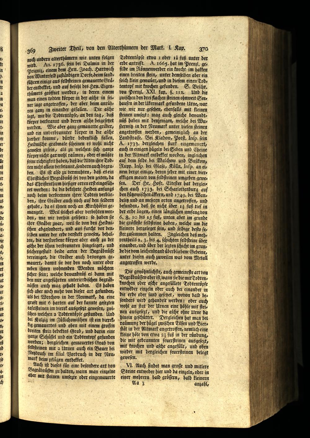 369 noch andern alterthuͤmern wie unten folgen wird. An. in d Prigniz/ einem dem Hrn. Ibach. Hartwich von Winterfeld zuſtaͤndigen Dorfe, beim ſandfuͤhren einige aus feldſteinen gemauerte Graͤher entdekket, und auf befehl des Hrn. Eigenthuͤmers geöffnet worden, in deren einem man einen todten koͤrper in der aſche in ſeiner lage angetroffen, der aber beim anruͤhren ganz in einander gefallen. Die aſche legt, wie die Todtentöͤpfe, an den tag, daß koͤrper verbrannt und deren aſche beigeſetzet worden. Wie aber ganz gemauerte graͤber, und ein unberbrannter koͤrper in die aſche hierher komme, dürfte bedenklich fallen. Heidniſche grabmale ſcheinen es wohl nicht geweſen zuſein, als zu welchen ſich ganze koͤrper nicht gar wohl raümen, oder es müßte feine richtigkeit haben, daß die Alten ihre Todten nicht allein verbrannt, ſondern auch begraben. Es iſt alſo zu vermuhten, daß es ein Chriſtliches Begraͤbnuͤß ſei von den zeiten, da das Chriſtenthum hieſiger orten erſt eingeführet worden: da die bekehrte Heiden anfangs noch beim verbrennen ihrer Todten verblieben, ihre Graͤber auch noch auf den feldern gehabt, da es ihnen noch an Kirchhoͤfen gemangelt. Weil ſolches aber verbohten worden, wie wir vorhin geſehen: ſo haben ſie ihre Graͤber zwar, weill fie von den Heidniſchen abgeſondert, und aus furcht vor denſelben unter der erde verſtekt geweſen, behalten, die verſtorbene köͤrper aber auch zu der aſche der ſchon verbrannten hingeleget, und ſolchergeſtalt beide arten der Begraͤbnuͤſſe bereiniget, die Graͤber auch deswegen gemauert, damit ſie vor den noch unter oder neben ihnen wohnenden Wenden moͤchten ſicher ſein; welche bewandnuͤß es dann mit den nur angeführten unterirrdiſchen begraͤbnuͤſſen auch mag gehabt haben. Es haben ſich aber noch mehr von dieſer art gefunden, als bei Wrechow in der Neumark, da eine gruft mit 6 harten auf der kannte geſezten tafelſteinen im vierek ausgeſezt geweſen, zwiſchen welchen 2 Todtentoͤpfe geſtanden. Und bei Kalzig im Zuͤllichowiſchen iſt ein vierekkig gemauertes und oben mit einem groſſen breiten ſtein bedektes Grab, und darin eine ganze Schuͤſſel und ein Todtentopf gefunden worden; dergleichen gemauertes Grab bon feldſteinen mit 2 Urnen auch ein Bauer bei Netbruch im filial Vorbruch in der Neu mark beim pflůgen entdekket.