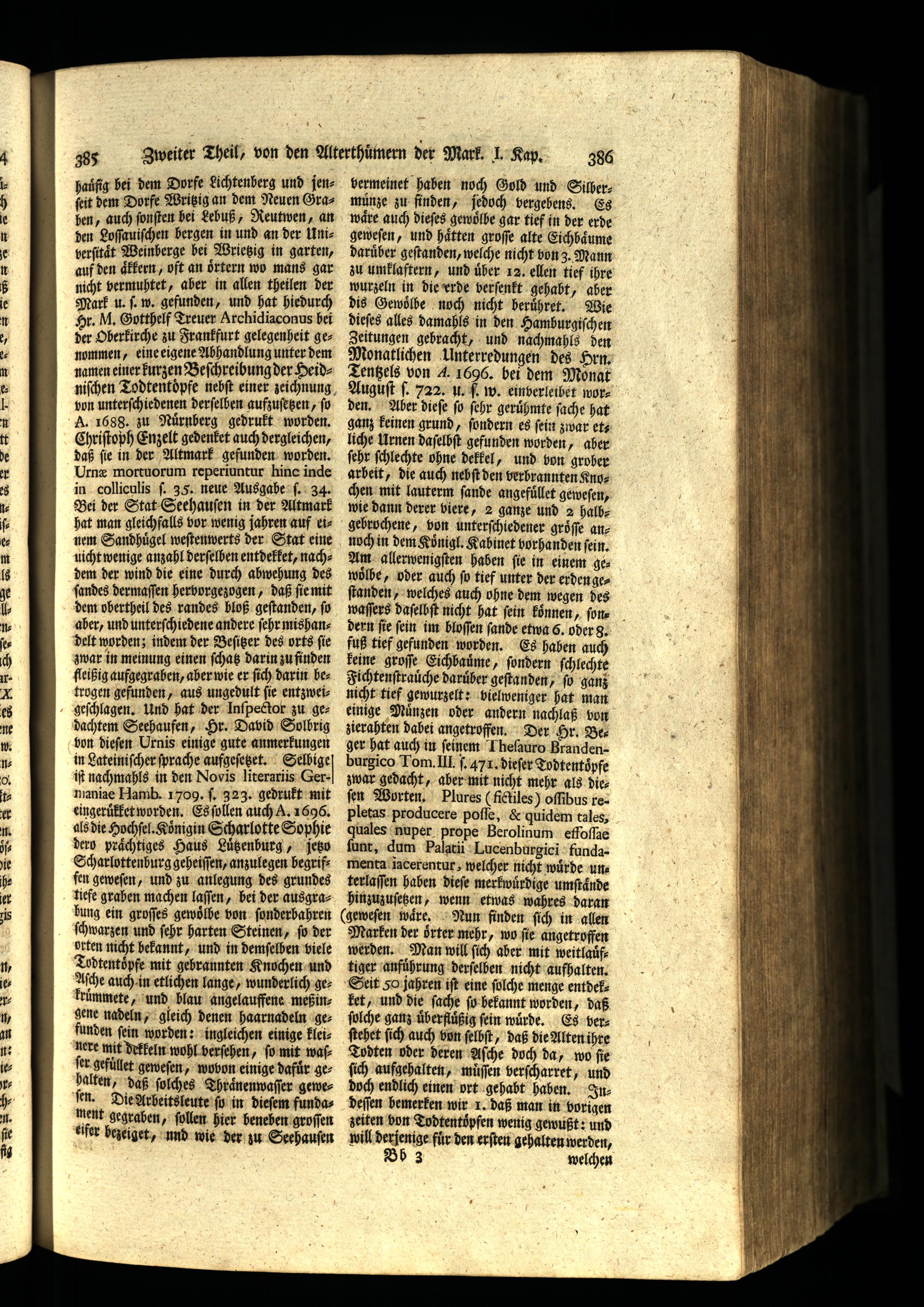 uicht wenige anzahl derſelhen entdelket, nachdem der wind die eine durch abwehung des ſandes dermaſſen herborgezogen, daß ſie mit dem obertheil des randes bloß geſtanden, ſo aber, und unterſchiedene andere ſehr mishandelt worden; indem der Beſitzer des orts ſie zwar in meinung einen ſchatz darin zu finden fleißig aufgegraben, aber wie er ſich darin betrogen gefunden, aus ungedult ſie entzweigeſchlagen. Und hat der Inſpector zu gedachtem Seehaufen, Hr. David Solbrig bon dieſen Urnis einige gute anmerkungen in Lateiniſcher ſprache aufgeſetzet.. iſt nachmahls in den Novis literariis Germaniae Hamb. 1709. ſ. 323. gedrukt mit eingeruͤkket worden. Es ſollen auch A. 1696. als die Hochſel. Königin Scharlotte Sophie dero praͤchtiges Haus Luͤtzenhurg, jetz Scharlottenburg geheiſſen, anzulegen begriffen geweſen, und zu anlegung des grundes tiefe grahen machen laſſen, bei der ausgrabung ein groſſes gewoͤlbe won ſonderbahren ſchwarzen und ſehr harten Steinen, ſo der orten nicht bekannt, und in demſelben viele