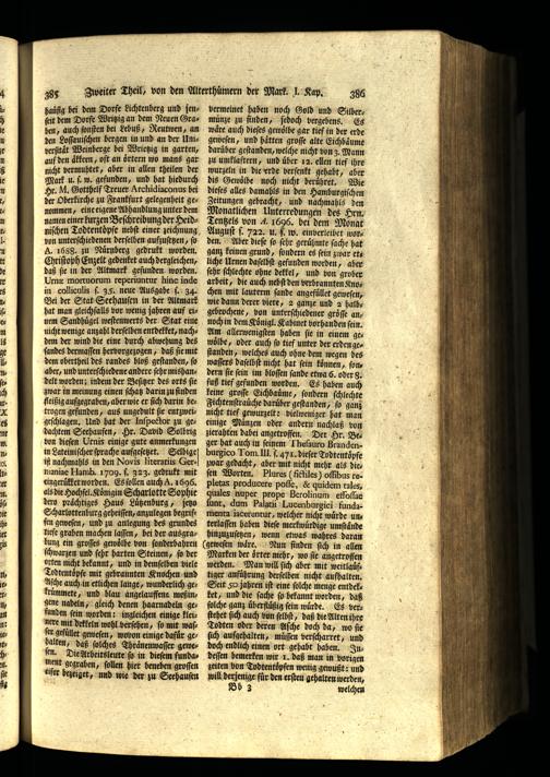 Marken der oͤrter mehr, wo ſie angetroffen werden. Man will ſich aber mit weitlauͤftiger anfuͤhrung derſelben nicht aufhalten. Seit 50 jahren iſt eine ſolche menge entdelket, und die ſache ſ bekannt worden, daß ſolche ganz uͤberfiuͤßig fein wuͤrde. Es verſtehet ſich auch bon ſelbſt, daß die Alten ihre Todten oder deren Aſche doch da, wo ſie ſich aufgehalten, muͤſſen verſcharret, und doch endlich einen ort gehabt haben. Indeſſen bemerken wir 1. daß man in vorigen zeiten von Todtentoͤpfen wenig gewußt: und will derjenige für den erſten gehalten werden,