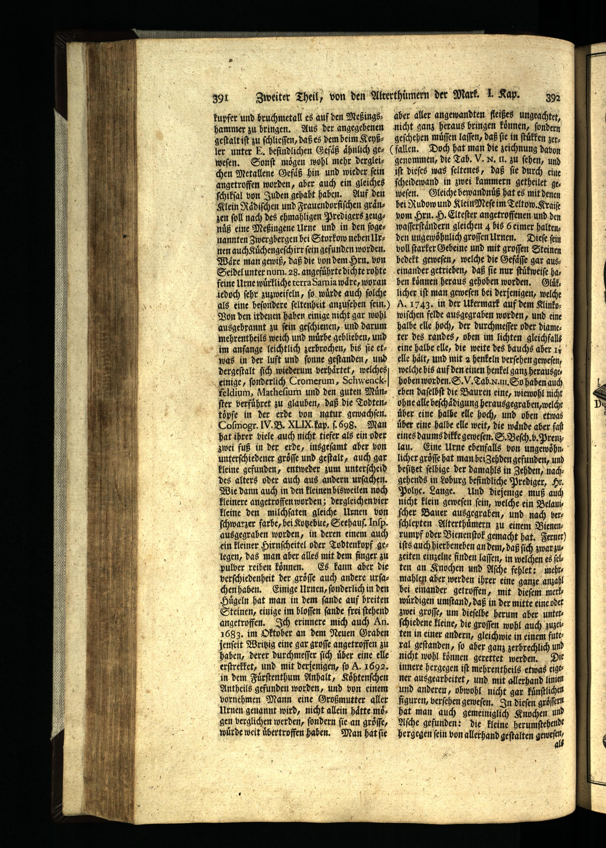 aber aller angewandten fleißes ungeachtet, nicht ganz heraus bringen konnen, ſondern geſchehen muſſen laſſen, daß fie in ſtuͤlken zer, (fallen. Doch hat man die zeichnung dabon genommen, die Tab. V. N, i. zu ſehen, und iſt dieſes was ſeltenes, daß fie durch eine ſcheidewand in zwei kammern getheilet ge, weſen. Gleiche bewandnuͤß hat es mit denen hei Rudow und Klein Meſe im Teltow. Kraiſe vom Hrn. H. Elteſter angetroffenen und den waſſerſtaͤndern gleichen 4 bis 6 eimer halten: den ungewohnlich groſſen Urnen. Dieſe fein voll ſtarker Gebeine und mit groſſen Steinen bedekt geweſen, welche die Gefaͤſſe gar auseinander getrieben, daß fie nur ſtůkweiſe hahen koͤnnen heraus gehoben worden. Glůͤk, licher iſt man geweſen bei derjenigen, welche A. 1743. in der Utermark auf dem Klinköwiſchen felde ausgegraben worden, und eine halbe elle hoch, der durchmeſſer oder diameter des randes, oben im lichten gleichfalls eine halbe elle, die weite des bauchs aber 1 elle halt, und mit 2 henkeln verſehen geweſen, welche bis auf den einen henkel ganz herausgehoben worden. S. V. Tab. x. jn. Si hahen auch eben daſelbſt die Bauren eine, wiewohl nicht ohne alle beſchaͤdizung herausgegraben, welche über eine halbe elle hoch, und oben etwas über eine halbe elle weit, die waͤnde aber faſt eines daums dilke geweſen. S. Beſch. h. Prenjlau. Eine Urne ebenfalls von ungẽwoͤhnlicher groͤſſe hat man bei Zehden gefunden, und beſitzet ſelbige der damahls in Zehden, nach gehends in Loburg befindliche Prediger, Hr. Polye. Lange. Und diejenige muß auch nicht klein geweſen fein, welche ein Belaui, ſcher Bauer ausgegraben, und nach ver ſchlepten Alterthuͤmern zu einem Bienen: rumpf oder Bienenſtok gemacht hat. Ferner) iſts auch hierheneben an dem, daß ſich zwar zuzeiten einzelne finden laſſen, in welchen es ſeten an Knochen und Aſche fehlet: mehr— mahlen aber werden ihrer eine ganze anzahl bei einander getroffen, mit dieſem merh würdigen umſtand, daß in der mitte eine der zwei groſſe, um dieſelbe herum aber unter ſchiedene kleine, die groſſen wohl auch zusei ten in einer andern, gleichwie in einem futeral geſtanden, ſo aber ganz zerbrechlich und nicht wohl koͤnnen gerettet werden. Die innere hergegen iſt mehrentheils etwas eigener ausgearbeitet, und mit allerhand linien und anderen, obwohl nicht gar kuͤnſtlichen figuren, verſehen geweſen. In dieſen groͤſſern hat man auch gemeiniglich Knochen u Aſche gefunden: die kleine herumſtehende hergegen ſein von allerhand geſtalten ier,