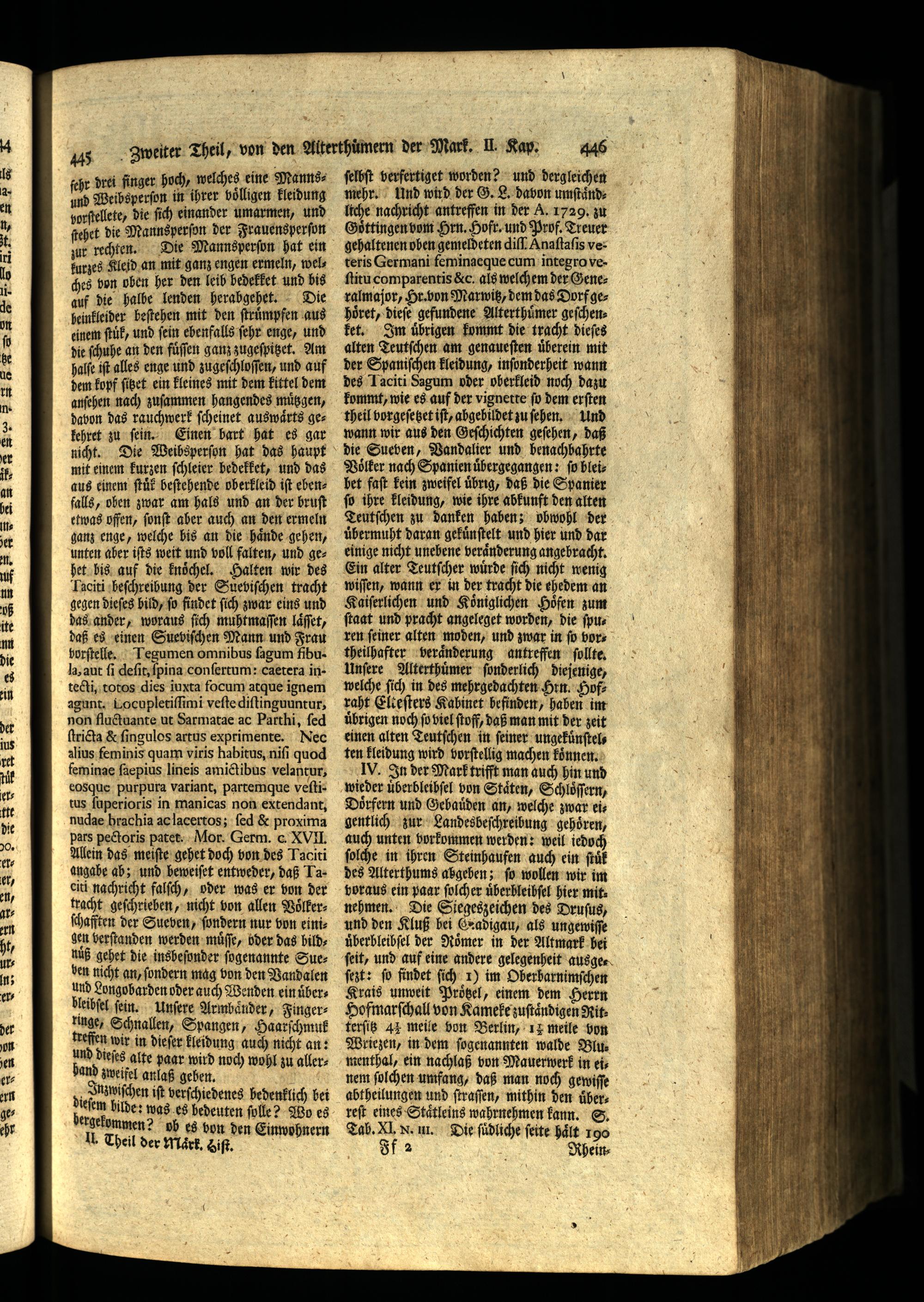 Voͤlker nach Spanien übergegangen: ſo bleibet faſt kein zweifel übrig, daß die Spanier ſo ihre kleidung, wie ihre abkunft den alten Teutſchen zu danken haben; obwohl der uͤbermuht daran gekuͤnſtelt und hier und dar einige nicht unebene veraͤnderung angebracht. Ein alter Teutſcher wuͤrde ſich nicht wenig wiſſen, wann er in der tracht die ehedem an Kaiſerlichen und Königlichen Höfen zum ſtaat und pracht angeleget worden, die ſpuren feiner alten moden, und zwar in ſo bortheilhafter veraͤnderung antreffen ſollte. Unſere Alterthuͤmer ſonderlich diejenige, welche ſich in des mehrgedachten Hrn. Hofraht Elteſters Kabinet befinden, haben im übrigen noch fo viel ſtoff, daß man mit der zeit einen alten Teutſchen in feiner ungekuͤnſtelten kleidung wird vorſtellig machen koͤnnen. V. In der Mark trifft man auch hin und wieder uͤberbleibſel von Staͤten, Schloͤſſern, Dörfern und Gehaüͤden an, welche zwar eis gentlich zur Landesbeſchreibung gehören,