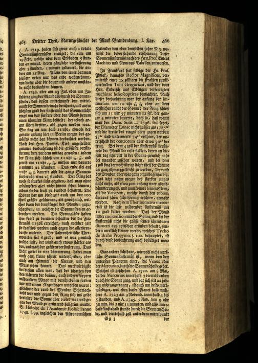 A. 1748. aber am 25 Jul. eben am Jakobi tag ging der Mond alſo durch die Sonnenſcheibe, daß deſſen mittelpunkt den mittelpunkt der Sonnen beinahe beruͤhrete/ und aufm höchſten grad der finſternuß das Sonnenlicht rings um das finſtere oder den Mond herum einen ſchmalen Ring behielt; der iedoch gegen ſuͤden breiter, als gegen norden war. Sie fing an um halb 11 uhr, obwohl der genaue anfang hier in Berlin wegen des gewoͤlkes nicht hat koͤnnen beobachtet werden. Nach des Hrn. Profeß. Kies angeſtellter genauen hebbachtung iſt die groͤſſeſte verſinſterung kurz vor dem mittag geweſen: indem der Ring ſich ſchloß um 11 uhr.. und zerriß um 11 uhr 4. tz. mithin nur dauerte z minute 22 ſekunden. Das ende fiel auf 1ñuhr. 5. dauerte alſo die ganze Sonnenſinſternuͤß etwa 23 ſtunden. Der Ring hat noch ſo ſtarkes licht gegeben, daß man ohne gedaͤmpftes glas nicht hinein ſehen koͤnnen; indem fie die kraft zu blenden behalten. Die Sonne hat um dieſe zeit auch um den 100 theil groͤſſer geſchienen, als gewöhnlich, welches dann der dunſtkugel des Monden zuzuſchreiben, in welcher die Sonnenſtralen gebrochen werden. Die Brennglaͤſer haben ihre kraft zu brennen behalten bis die Finſternuͤß 11 zoll erreichet, nach welcher zeit ſie kraftlos worden auch gegen die allerbrenbarſte materie. Der Fahrenheitiſche Thermometer fiel Hgrad, und es war ziemlich friſche luft, der wind auch etwas ſtaͤrker als dor, und nach der größten verſinſterung. Das Licht geriet in eine daͤmmerung, dahei man auch ganz kleine ſchrift unterſcheiden, aber auch am Himmel die Venus und den Mars ſehen konnte. Das merkwuͤ rdigſte bei dieſem allen war, daß der ſchatten bon den blättern der bauůme, auch andern Körpern waͤhrendem Ringe mit verſchiedenen farben wie mit einem Regenbogen umgeben waren: Aleichwie der rand des Monden Scharlachroht war und gegen den Ring ſich ins gelbe derlohr; die Sonne aber violet war und geEn de ond zu grin und pelggrin wurde,