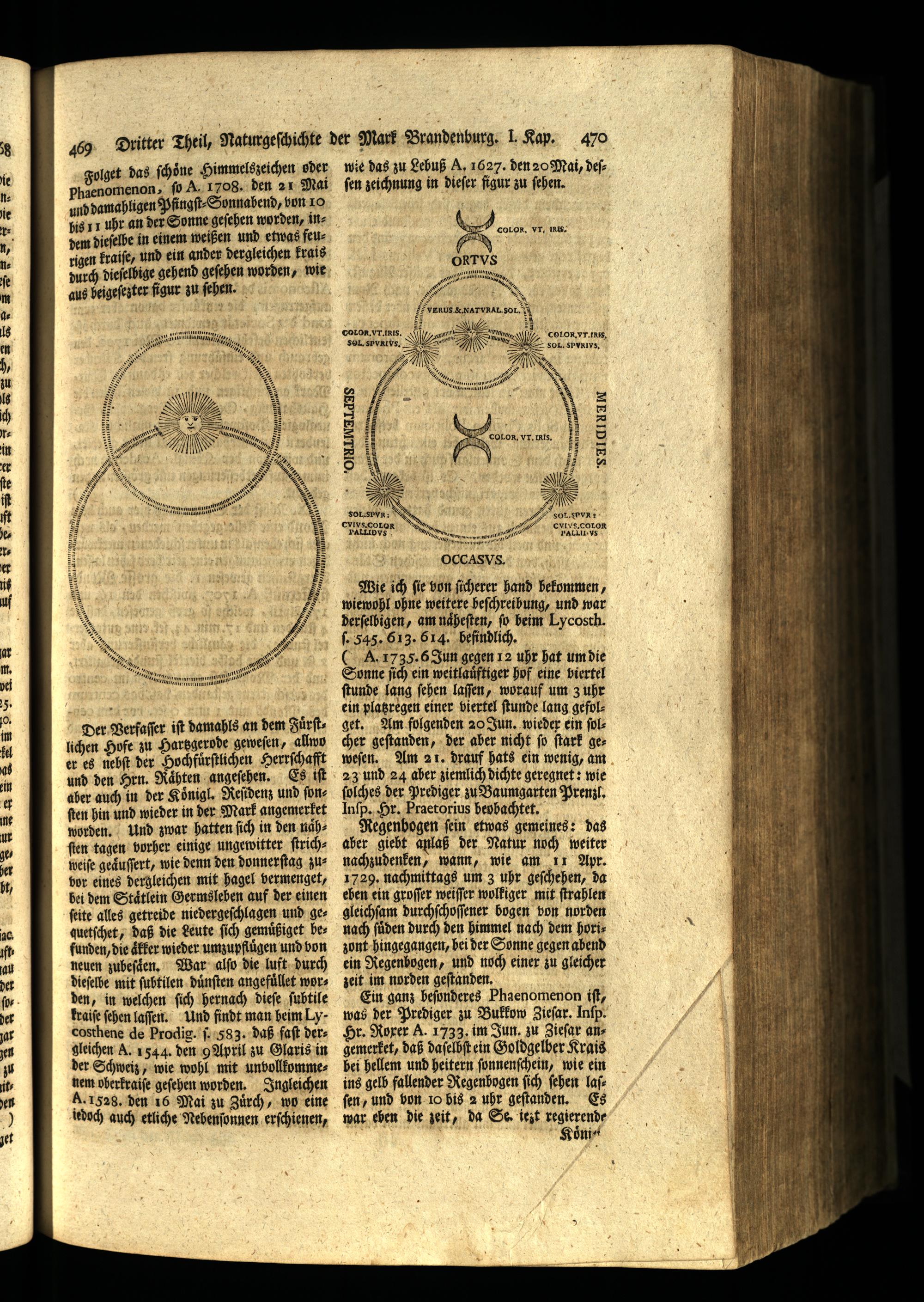 zerfaſſer iſt damahls an dem Fuͤrſt⸗ get. Am folgenden 20 Jun. wieder ein fol en,.. ö geweſen, allwo cher geſtanden, der aber nicht ſo ſtark geer es nebſt der Hochfuͤrſtlichen Herrſchafft weſen. Am 21. drauf hats ein wenig, am und den Hrn. Raͤhten angeſehen. Es iſt 23 und 24 aber ziemlich dichte geregnet: wie aber auch in der Koͤnigl. Reſidenz und ſon, ſolches der Prediger zu Baumgarten Prenzl. ſten hin und wieder in der Mark angemerket Inſp. Hr. Praetorius beobachtet.. worden. Und zwar hatten ſich in den nah ⸗ Regenbogen fein etwas gemeines: das ſten tagen vorher einige ungewitter ſtrich⸗ aber giebt anlaß der Natur noch weiter weiſe geaͤuſſert, wie denn den donnerſtag zu⸗ nachzudenken, wann, wie am 11 Apr. vor eines dergleichen mit hagel vermenget, 1729. nachmittags um 3 uhr geſchehen, da bei dem Staͤtlein Germsleben auf der einen eben ein groſſer weiſſer wolkiger mit ſtrahlen ſeite alles getreide niedergeſchlagen und ges gleichſam durchſchoſſener bogen von norden quetſchet, daß die Leute ſich gemuͤiget bes nach ſuͤden durch den himmel nach dem horifanden, die aͤkker wieder umzupfiuͤgen und hon zont hingegangen, bei der Sonne gegen abend neuen zubefäen, War alſo die luft durch ein Regenbogen, und noch einer zu gleicher dieſelbe mit ſubtilen duͤnſten angefuͤllet wor⸗ zeit im norden geſtanden. den, in welchen ſich hernach dieſe ſubtile Ein ganz beſnderes Phaenomenon iſt, kraiſe ſchen laſſen. Und findt man beim Ly was der Prediger zu Bukkom Zieſar. Inſp. costhene de Prodig. ſ. 583. daß faſt der Hr. Roxer A. 1733. im Jun, zu Zieſar an» gleichen A. 1544. den 9April zu Glaris in gemerket, daß daſelbſt in Goldgelber Krais der Schweiz, wie wohl mit unvollkomme⸗ bei hellem und heitern ſonnenſchein, wie ein nem oberkraiſe geſehen worden. Ingleichen ins gelb fallender Regenbogen ſich ſehen laſA.1528, den 16 Mai zu Zuͤrch, wo eine ſen, und von 10 bis 2 uhr geſtanden. Es iedoch auch etliche Nebenſonnen erſchienen, war ehen die zeit, da Se. iezt regierende