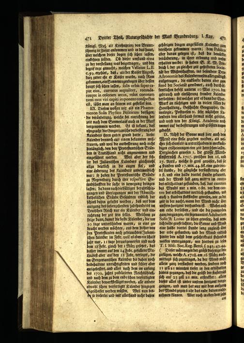 gehörigen dingen angefüllete Kalender zum vorſchein gekommen waren; dem Publico aber daran gelegen iſt, daß die bewuͤrkte veraͤnderung, in ihrer ordnung und weſen erhalten werde: fo haben S. K. M. Frie, drich l. der zu gleicher zeit geſtifteten Socie tät der Wiſſenſchafften, ins beſondere Dero Aſtronomis das Kalenderweſen allergnaͤdigſ aufgetragen, die einkunfte dabon aber zum fond der Societaͤt gewidmet, auch durch zy fentlichen befehl unterm 10 Mai 1700. den gebrauch und einfuͤhrung fremder Kalender verbohten: ſeit welcher zeit es dann der Chur, Mark an tuͤchtigen und in vielen fällen die Haushaltung, Geſchichte Geographie, Genealogie, Poſtweſen ꝛc. ſehr nuͤzlichen Kalendern von allerhand format nicht gefehlet, und wird von der Koͤnigl. Academie noch immer auf verbeſſerungen und groͤſſern nutzen gedacht. r N. Naͤhſt der Sonne muß hier auch dem Mond eine ſtelle gegeben werden, als wel cher ſich ebenfals in unterſchiedenen merlwuͤrdigen erſcheinungen eine zeit hero ſehen laſſen. Dergleichen geweſen 1. die groſſe Mondſinſternuͤß A. 1707. zwiſchen den 16. und 17. April, welche ſo groß geweſen, daß ſie 4 ſtunden und 17. min. 44. ſek. eine gute viertel ſtunde, die gaͤnzliche berſinſterung aber 2 ſt. und eine halbe viertel ſtunde gedauert, und der Mond faſt ganz mitten im centro des erdſchattens geſtanden, daß das centrum des Monds nur 1 min. O ſec. vor dem centro des erdſchattens nordlich geſtanden, und auch 2 ſtunden ſtokfinſter geweſen, wie zu der zeit in der nacht, wann der Mond nicht über unſerm horizont vorhanden iſt. Wobei auch am ende derſelben, und ehe die penumbta ganz bergangen, ein ſogenanntes Adulterium dolis& Lunae zu ſehen geweſen, daß nemlich beide groſſe lichter, die Sonne und Mond eine halbe viertel ſtunde lang zugleich über der erde geſtanden, und der Mond endlich hinter den naͤhſt dem geſichtskrais ſtehenden wolken untergangen, wie hierbon zu leſen TI Miſc. Soc. Reg. Berol.ſ 242. 43. 4. ¶ Dieſer waͤre wegen der groͤſſe diejenige beis zufügen, welche A. 1718. am 16 Maͤrz nach mittags ſich zugetragen, da der Mond nicht allein ganz verfinſtert worden, ſondern noch 11 zoll 2m minuten tiefer in den erdſchatten hinein gegangen, daß die groͤſſe der ſinſternuß ſich auf 23 zoll an min. erſtrekket: allein dieſes alles iſt unter unſerm horizont borgegangen, und man hat nur mit dem aufgang des Monds gegen 6 uhr das ende davon wahrnehmen koͤnen. Aber noch in ehen dem Jahr 9