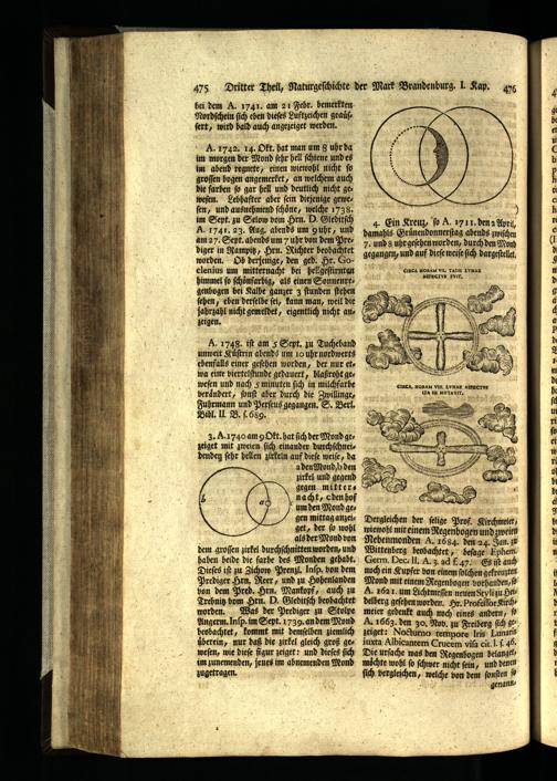 A. 1742. 14. Okt. hat man um 8 uhr da im morgen der Mond ſehr hell ſchiene und es im abend regnete, einen wiewohl nicht fü groſſen bogen angemerket, an welchem auch die farben ſo gar hell und deutlich nicht geweſen. Lebhafter aber ſein diejenige gewefen, und ausnehmend ſchoͤne, welche 1733. im Sept. zu Selow vom Hrn. D. Gleditſch A. 1741. 23. Aug. abends um guhr, und am 27. Sept. abends um 7 uhr von dem Prediger in Rampitz, Hrn. Richter beobachtet worden. Oh derjenige, den ged. Hr. Goclenius um mitternacht bei hellgeſtirnten