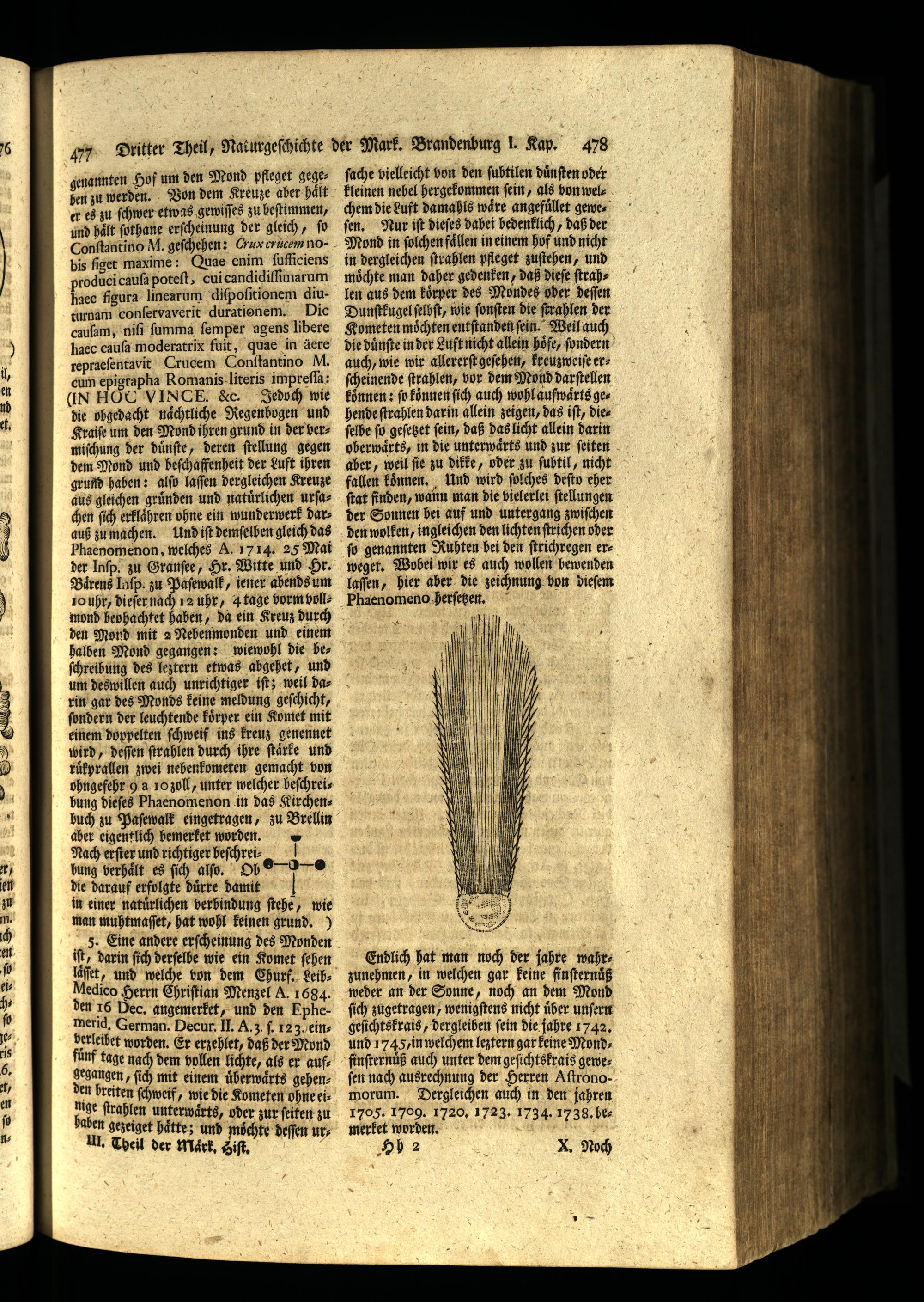rin gar des Monds keine meldung geſchicht, ſondern der leuchtende koͤrper ein Komet mit einem doppelten ſchweif ins kreuz genennet wird, deſſen ſtrahlen durch ihre ſtaͤrke und ruͤkprallen zwei nebenkometen gemacht von ohngefehr 9 a 10 zoll, unter welcher beſchreibung dieſes Phaenomenon in das Kirchen