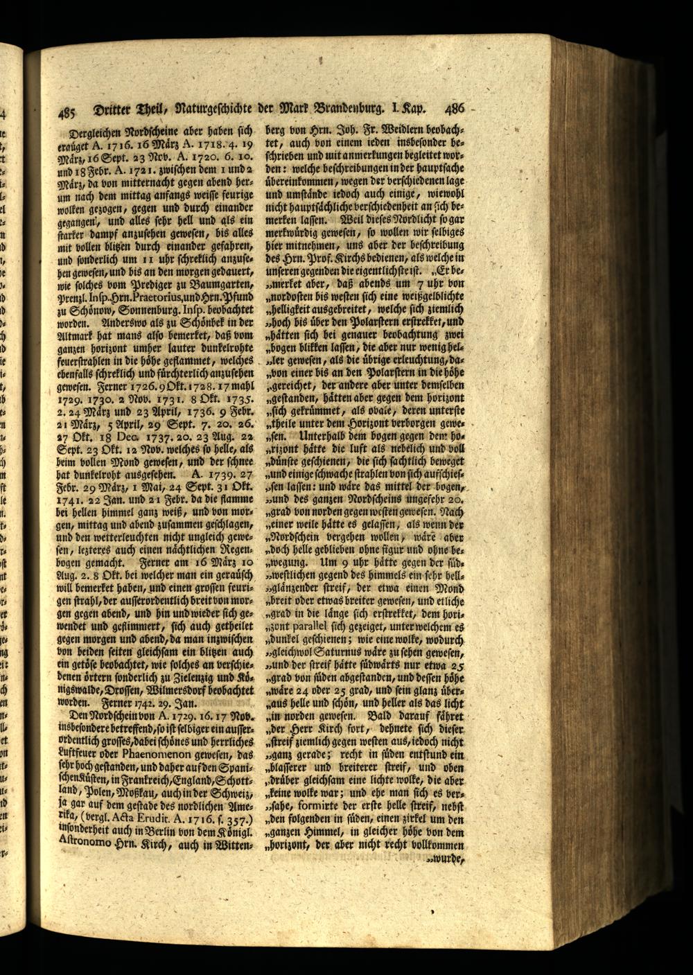 erauͤget A. 1716. 16 März A. 1718. 4. 19 März, 16 Sept. 23 Ned. A. 1720. 6. 10. und 18 Febr. A. 1721. zwiſchen dem 1 und 2 März, da von mitternacht gegen abend herum nach dem mittag anfangs weiſſe feurige wolken gezogen, gegen und durch einander gegangen, und alles ſehr hell und als ein ſtarker dampf anzuſehen geweſen, bis alles mit vollen blitzen durch einander gefahren, und ſonderlich um 11 uhr ſchreklich anzuſehen geweſen, und bis an den morgen gedauert, wie ſolches vom Prediger zu Baumgarten, Prenzl. Inſp. Hrn. Praetorius, und Hrn. Pfund zu Schoͤnow, Sonnenburg. Inſp. beobachtet worden. Anderswo als zu Schoͤnbek in der Altmark hat mans alſo bemerket, daß vom ganzen horizont umher lauter dunkelrohte