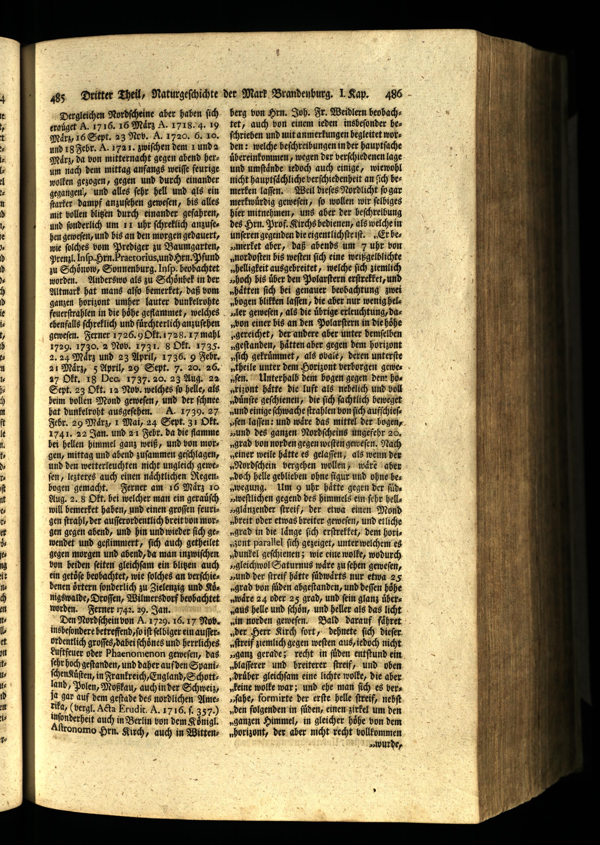 berg von Hrn. Joh. Fr. Weidlern beobachtet, auch von einem ieden insheſonder be ſchrieben und init anmerkungen begleitet worden: welche beſchreibungen in der hauptſache uͤbereinkommen, wegen der verſchiedenen lage und umſtaͤnde iedoch auch einige, wiewohl nicht hauptſaͤchliche berſchiedenheit an ſich bemerken laſſen. Weil dieſes Nordlicht ſo gar merkwuͤrdig geweſen, ſo wollen wir ſelbiges hier mitnehmen, uns aber der beſchreibung des Hrn. Prof. Kirchs bedienen, als welche in unſeren gegenden die eigentlichſte iſt. Er bes merket aber, daß abends um 7 uhr von nordoſten bis weſten ſich eine weißgelblichte helligkeit ausgebreitet, welche ſich ziemlich „hoch bis über den Polarſtern erſtrekket, und „hätten ſich bei genauer beobachtung zwei „bogen blikken laſſen, die aber nur wenig hel„ler geweſen, als die uͤbrige erleuchtung, da„von einer bis an den Polarſtern in die höhe gereichet, der andere aber unter demſelben geſtanden, hätten aber gegen dem hörizont „ſich gekruͤmmet, als ovale, deren unterſte „teile unter dem Horizont verborgen geweFſen. Unterhalb dem bogen gegen dem ho„rizont haͤtte die luft als nebelich und voll