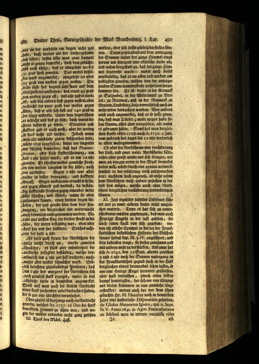 „helle, doch breiter als der vorhergehende „und höher; deſſen hoͤhe man zwar damals „nicht ſo genau bemerket, cht nnß nach ſchaͤßt, daß er ohngefehr 20 bis „zo grad hoch geweſen. Das mittel deſſelden ward angemerket, ohngefehr 20 oder „az grad von norden gegen weſten. Die „beide fuͤſſe des bogens ſahe man auf dem Geſichtskrais aufſtehen: den einen 45 grad „von norden gegen oſt, und alſo juſt in nord„oft, und den andern faſt gegen weſten, oder „vielleicht ein paar grad von weſten gegen „ſiden, daß er alſo ſich faſt auf 140 grad in der laͤnge erſtrekte. Unter dem bogen ſchien es neblicht und dick zu ſein; doch waren die ſterne dadurch zu ſehen. Strahlen und „Alaffern gab es auch noch, aber bei weiten fo ſtark nicht als vorher. Jedoch wenn man alle umſtaͤnde genau beſchreiben ſolte, „würde es zu lang fallen, daher wir folgends nur kuͤrzlich bemerken, daß das Phaeno