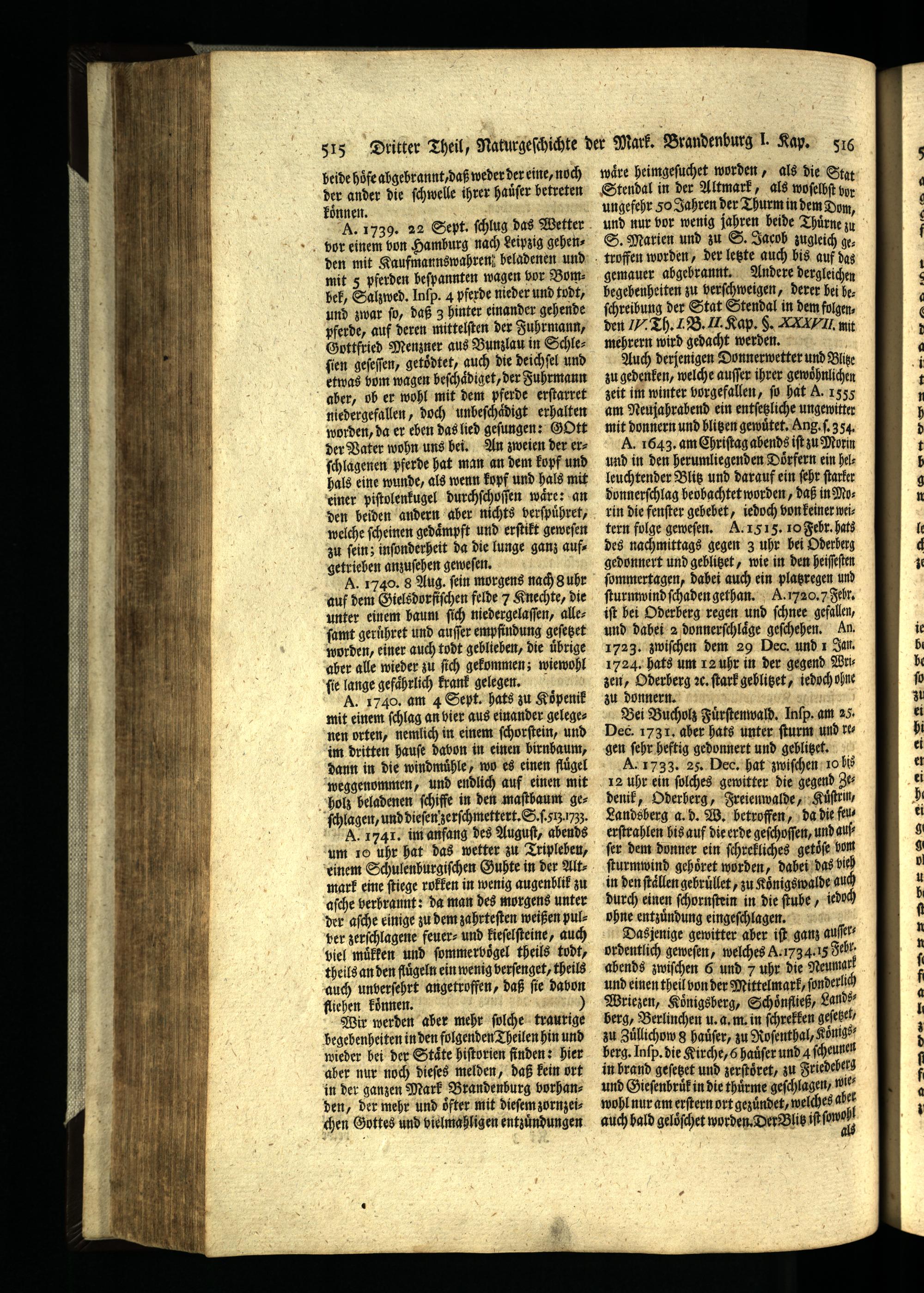 A. 1643. am Chriſtag abends iſt zu Morin und in den herumliegenden Doͤrfern ein helleuchtender Blitz und darauf ein ſehr ſtarker donnerſchlag beobachtet worden, daß in Morin die fenſter gehebet, iedoch von keiner weitern folge geweſen. A.rI5 15. 10 Fehr. hats des nachmittags gegen 3 uhr bei Oderberg gedonnert und geblitzet, wie in den heiſſeſten ſommertagen, dabei auch ein platzregen und ſturmwind ſchaden gethan. A. 20.7 Fehr. iſt bei Oderberg regen und ſchnee gefallen, und dabei 2 donnerſchlaͤge geſchehen. An. 1723. zwiſchen dem 29 Dec. und 1 Jan. 1724. hats um 12a uhr in der gegend Wrizen, Oderberg ꝛc. ſtark geblitzt, iedoch ohne zu donnern.