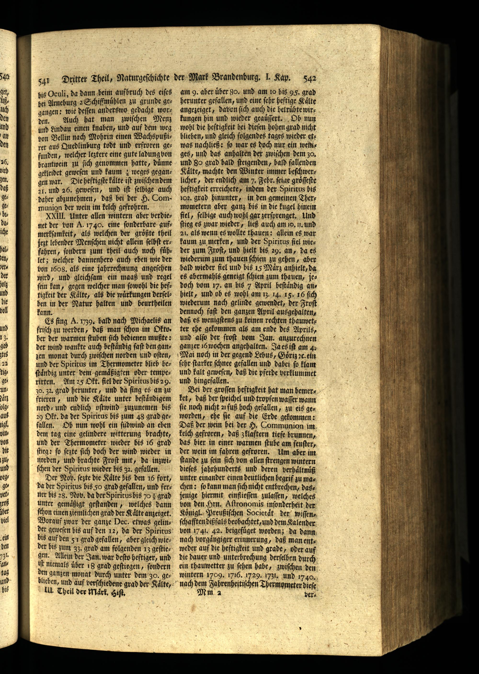 ſehr ſtarker ſchnee gefallen und dabei fo klam und kalt geweſen, daß die pferde verklummet und hingefallen. J Bei der groſſen heftigkeit hat man bemerket, daß der ſpeichel und tropfen waſſer wann fie noch nicht 2 fuß hoch gefallen, zu eis geworden, ehe ſie auf die Erde gekommen: Daß der wein bei der H. Communion im kelch gefroren, daß zklaftern tiefe brunnen, das bier in einer warmen ſtube am fenſter, der wein im fahren gefroren. Um aber im ſtande zu ſein ſich von allen ſtrengen wintern dieſes jahrhunderts und deren verhaͤltnuͤß unter einander einen deutlichen begrif zu machen: ſo kann man ſich nicht entbrechen, dasjenige hiermit einflieſſen zulaſſen, welches bon den Hrn. Aſtronomis inſonderheit der Koͤnigl. Preußiſchen Societaͤt der wiſſenſchafften dißfals beobachtet, und dem Kalender von 1741. 42. beigefuͤget worden; da dann nach vorgaͤngiger erinnerung, daß man entweder auf die heftigkeit und grade, oder auf die dauer und unterbrechung derſelben durch ein thauwetter zu ſehen habe, zwiſchen den wintern 1709. 1716, 1729, 1731. und 1740. nach dem Fahrenheitiſchen Thermometer dieſe Mm a2 ver