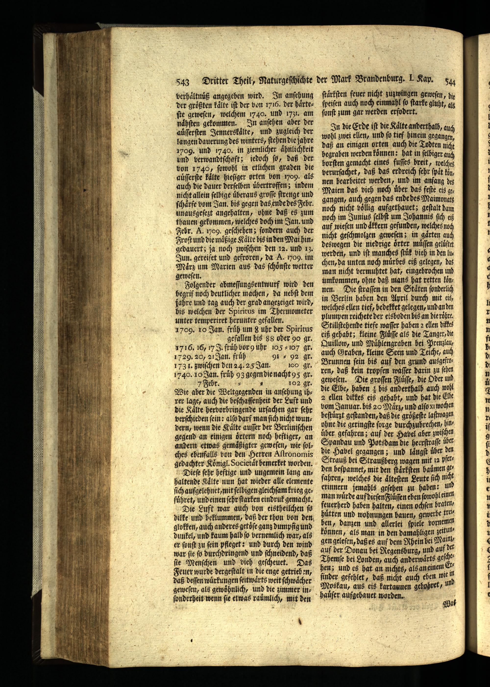 geweſen. Folgender abmeſſungsentwurf wird den begrif noch deutlicher machen, da nebſt dem jahre und tag auch der grad angezeiget wird, bis welchen der Spiritus im Thermometer unter temperiret herunter gefallen. 1709. 10 Jan. früh um 8 uhr der Spiritus .—⁊rfeefallen bis 88 oder 90 gr. 1716. 16, 7 J. fruuͤh bor uhr 105 ⸗107 gr. 1729. 20, 21 Jan. fruuͤh 91 92 gr. 1731. zwiſchen den 24. 25 Jan. 100 gr. 1740. 10 Jan. fruͤh 93 gegen die nacht 95 gr. 7 Febr.= ö 102 gr. Wie aber die Weltgegenden in anſehung ihrer lage, auch die beſchaffenheit der Luft und die Kälte hervorbringende urſachen gar ſehr verſchieden ſein: alſo darf man ſich nicht wun