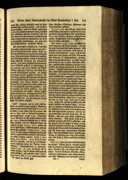 am 1 und 2 März eintretenden Froſt ziemlich verſalzen, als welcher den ganzen Marz und zwar in ſolcher haͤrte angefallen, daß die fruͤhzeitig herausgetretene knospen und bluͤhte an den Aprikoſen und weiſſen Kirſchen gaͤnzlich berderbet worden: wiewohl ſelbige weder den übrigen baum⸗noch feldfruͤchten den geringſten ſchaden gethan; geſtallt dann die bauͤme ſonderlich Sauerkirſchen auch Apfel⸗ u. Birnbauͤme uͤberaus ſtark gebluͤhet und angeſetzet. Gleiche wuͤrkung hat die waͤrme gehabt bei einigen Waſſerthieren. Am 6 Dec. 1746. und um den 20 Jan. 1747. auch am 16 Febr. 1750. lieſſen ſich auf den gewaͤſſern hin und wieder Froͤſche und Kroͤten ſehen, bei welchen bei genauer unterſuchung befunden wur. de, daß das ovarium wie in der leichzeit ganz dik und aufgetrieben geweſen: aber bei ein getretener kaͤlte ſein dieſe kreat uren alle geſtorben, und der roog theils zerſprungen, theils verfaulet. Auf gleiche weiſe ſein in gewiſſen gegenden alle Bleie geſtorben: und die Herren Phyſici haben in deren ovario eben das gefunden, was der Hr. D. Gleditſch in obigen Froͤſchen und Kroͤten hemerket. Woraus ſich dann ganz ungezwungen ſchlieſſen