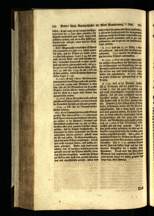 XXV. Wegen auſſerordentlichen Schnees ſein anzumerken die jahre 763. dabon gemeldet wird, daß der Schnee an vielen orten 20 ellen hoch gelegen. Angel. ſ. 24. der aber wohl eben die Mark nicht wird betroffen haben; dergleichen bewandnuͤß es ohne zweifel auch mit andern jahren haben wird, als 975. da auf Servati tag noch ſtarker ſchnee gefallen ſ. 55. und 987. 1334. da am 7 Okt. ein Schnee gefallen, davon die baüme ſchaden ges litten. Angel. ſ. 138. a