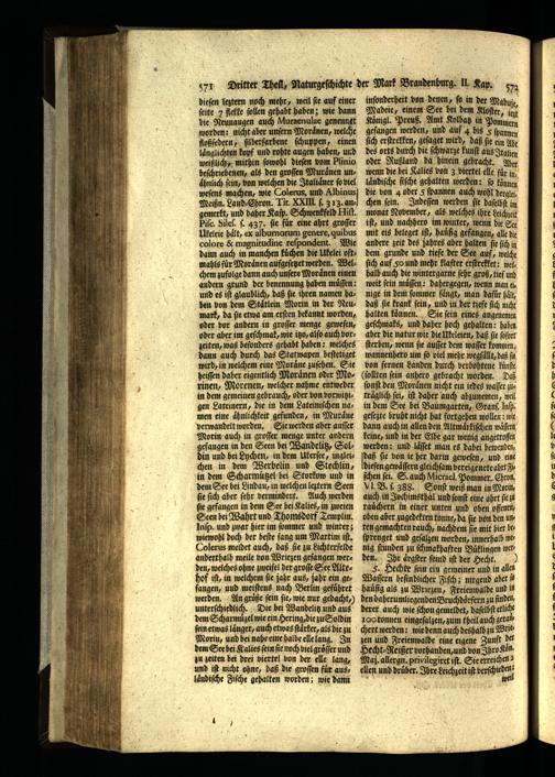 Pife. Sileſ. ſ. 437. fie für eine ahrt groſſer Ukeleie haͤlt, ex alburnorum genere, quibus colore& magnitudine reſpondent. Wie dann auch in manchen kuchen die Ukelei oftmahls fuͤr Moraͤnen aufgeſetzet werden. Welchem zufolge dann auch unſere Moraͤnen einen andern grund der benennung haben muͤſſen: und es iſt glaublich, daß ſie ihren namen haben von dem Staͤtlein Morin in der Neumark, da fie etwa am erſten bekannt worden, oder vor andern in groſſer menge geweſen, oder aber im geſchmal, wie itz⸗, alſo auch vorzeiten, was befonders gehabt haben: welches dann auch durch das Stat wapen beſtetiget wird, in welchem eine Moraͤne zuſehen. Sie heiſſen daher eigentlich Moraͤnen oder Morinen, Morenen, welcher nahme entweder in dem gemeinen gebrauch, oder von vorwitzigen Lateinern, die in dem Lateiniſchen namen eine aͤhnlichkeit gefunden, in Muraͤne verwandelt worden. Sie werden aber auſſer Morin auch in groſſer menge unter andern gefangen in den Seen bei Wandelitz, Soldin und bei Lychen, in dem Ukerſee, ingleichen in dem Werbelin und Stechlin, in dem Scharmuͤtzel bei Storkow und in dem See bei Lindau, in welchen leztern Seen ſie ſich aber ſehr vermindert. Auch werden ſie gefangen in dem See hei Kalies, in zweien Seen bei Wahrt und Thomsdorf Templin. Inſp. und zwar hier im ſommer und winter; wiewohl doch der beſte fang um Martini iſt. Colerus meldet auch, daß ſie zu Lichterfelde anderthalb meile von Wriezen gefangen werden, welches ohne zweifel der groſſe See Altehof iſt, in welchem ſie jahr aus, jahr ein ge