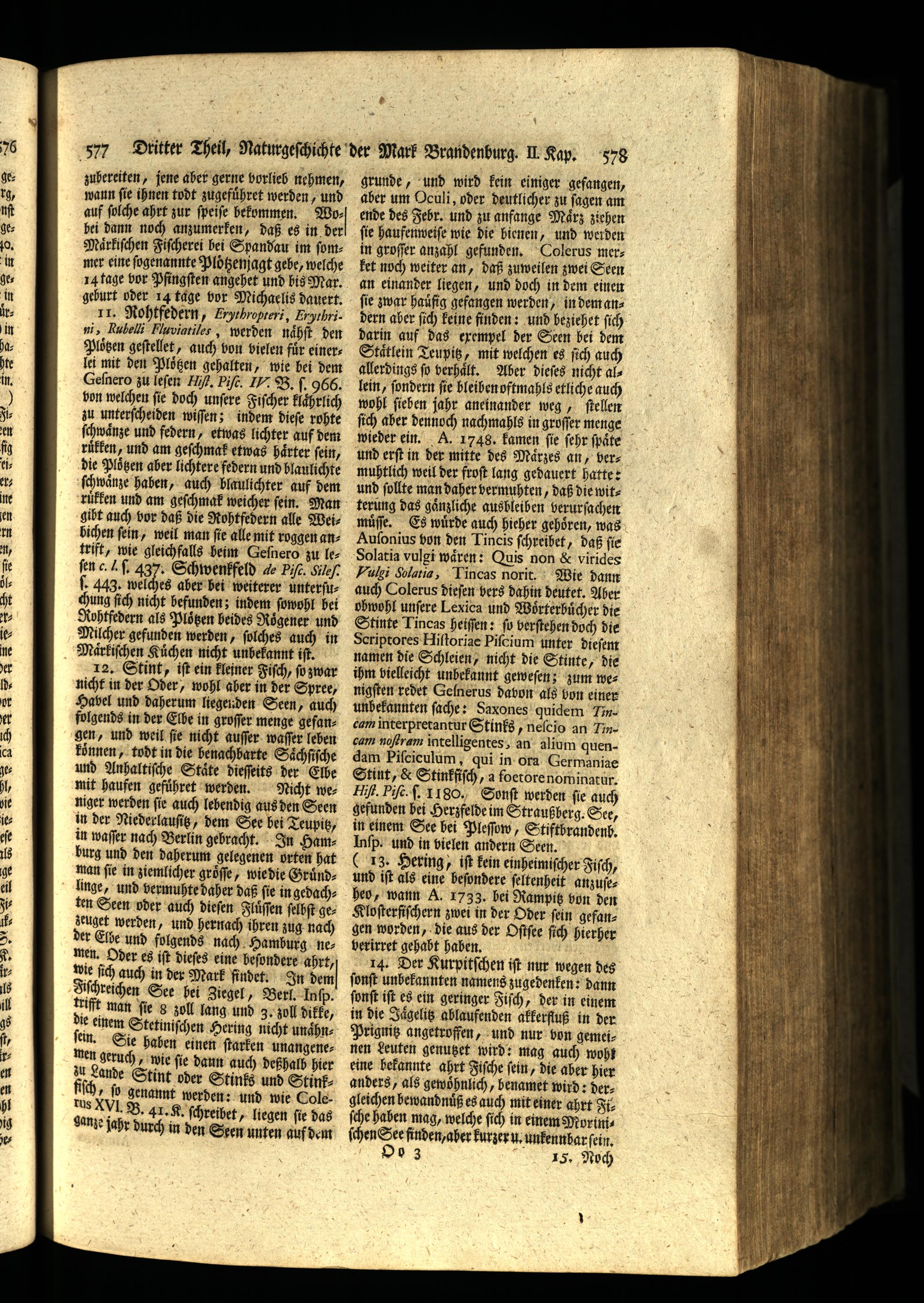 gibt auch bor daß die Rohtfedern alle Weibichen ſein, weil man ſie alle mit roggen antrift, wie gleichfalls heim Geſners zu lefen c l ſ. 437. Schwenkfeld de Ppiſt. Sk/ . 443. welches aber bei weiterer unterſuchung ſich nicht befunden; indem ſowohl bei Nohtfedern als Plögen beides Roͤgener und Milcher gefunden werden, ſolches auch in Maͤrkiſchen Küchen nicht unbekannt iſt. 12. Stint, iſt ein kleiner Fiſch, ſo zwar nicht in der Oder, wohl aher in der Spree,