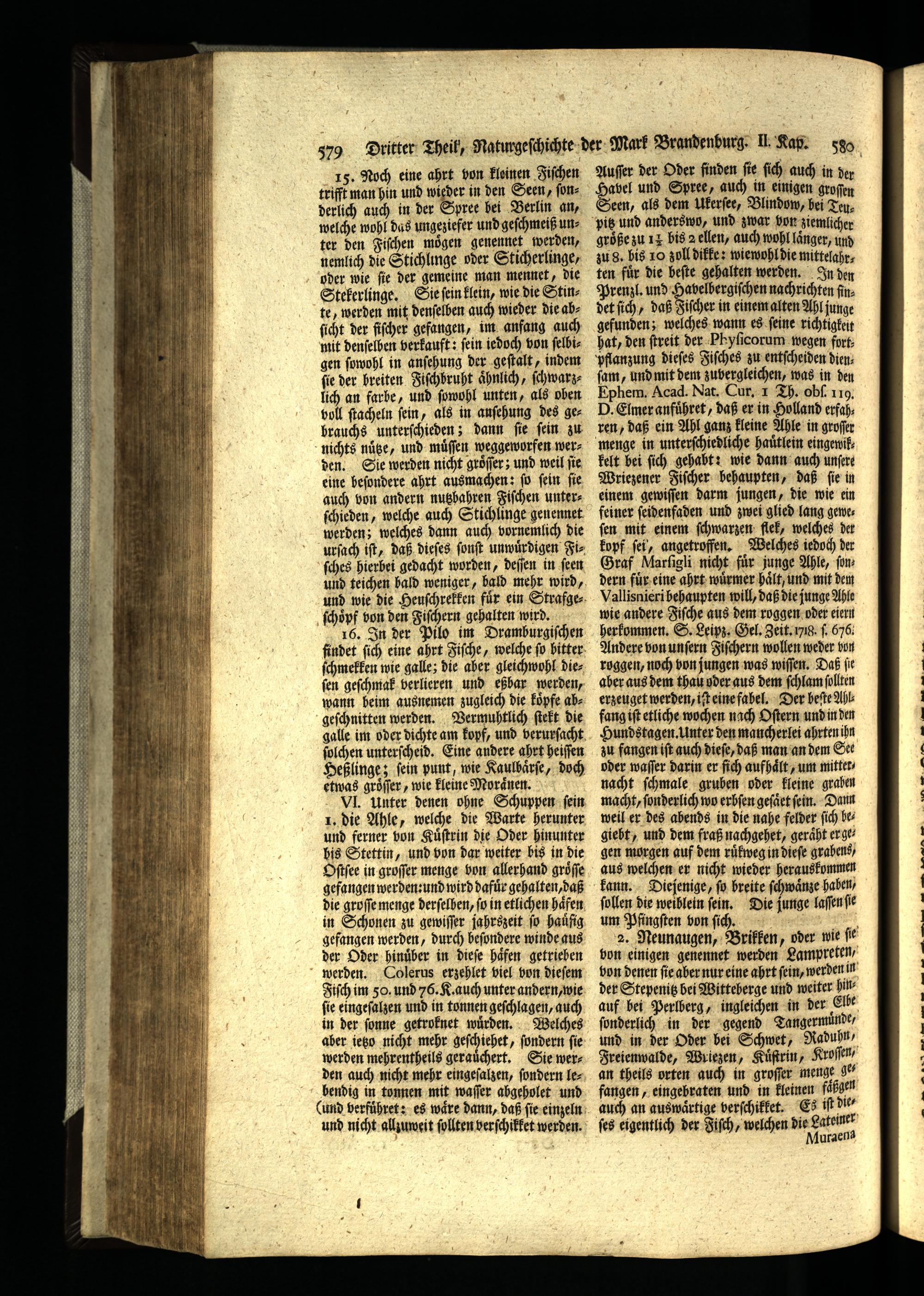 VI. Unter denen ohne Schuppen ſein 1. die Ahle, welche die Warte herunter und ferner von Kuͤſtrin die Oder hinunter bis Stettin, und von dar weiter bis in die Oſtſee in groſſer menge von allerhand groͤſſe gefangen werden: und wird dafuͤr gehalten, daß die groſſe menge derſelben, fo in etlichen haͤfen in Schonen zu gewiſſer jahrszeit ſo haufig gefangen werden, durch beſondere winde aus der Oder hinuͤber in dieſe haͤfen getrieben werden. Colerus erzehlet viel von dieſem Fiſch im 50. und 76. K. auch unter andern, wie ſie eingeſalzen und in tonnen geſchlagen, auch in der ſonne getroknet wurden. Welches aber ietzo nicht mehr geſchiehet, ſondern ſie werden mehrentheils gerauͤchert. Sie werden auch nicht mehr eingeſalzen, ſondern lebendig in tonnen mit waſſer abgeholet und