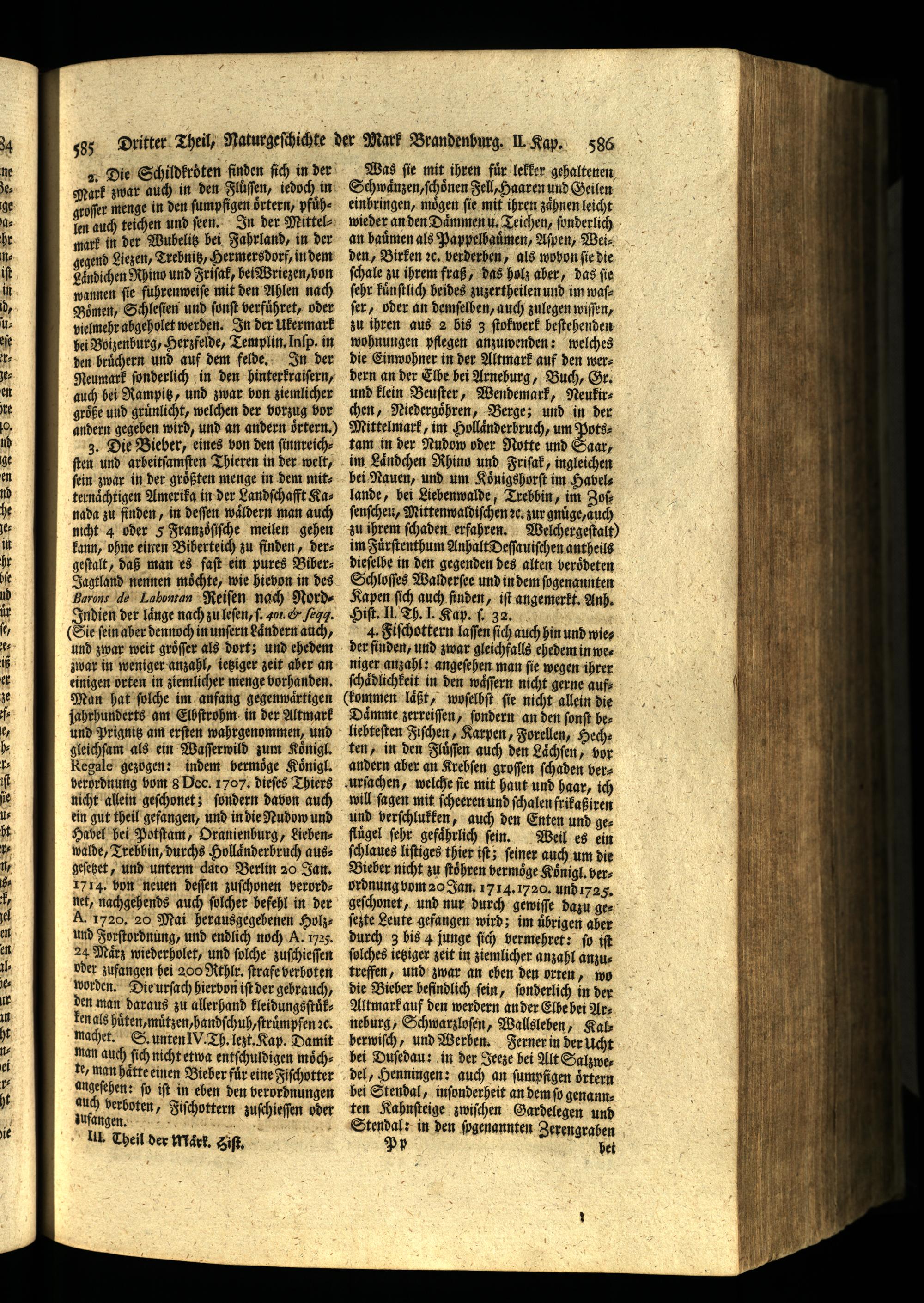 3. Die Bieber, eines von den ſinnreichſten und arbeitſamſten Thieren in der welt, ſein zwar in der groͤßten menge in dem mitternaͤchtigen Amerika in der Landſchafft Kanada zu finden, in deſſen waͤldern man auch nicht 4 oder 5 Franzoͤſiſche meilen gehen kann, ohne einen Biberteich zu finden, dergeſtalt, daß man es faſt ein pures BiberJagtland nennen moͤchte, wie hievon in des Barone de Lahontan Reifen nach NordIndien der laͤnge nach zu leſen, 1. 401.& Sag.