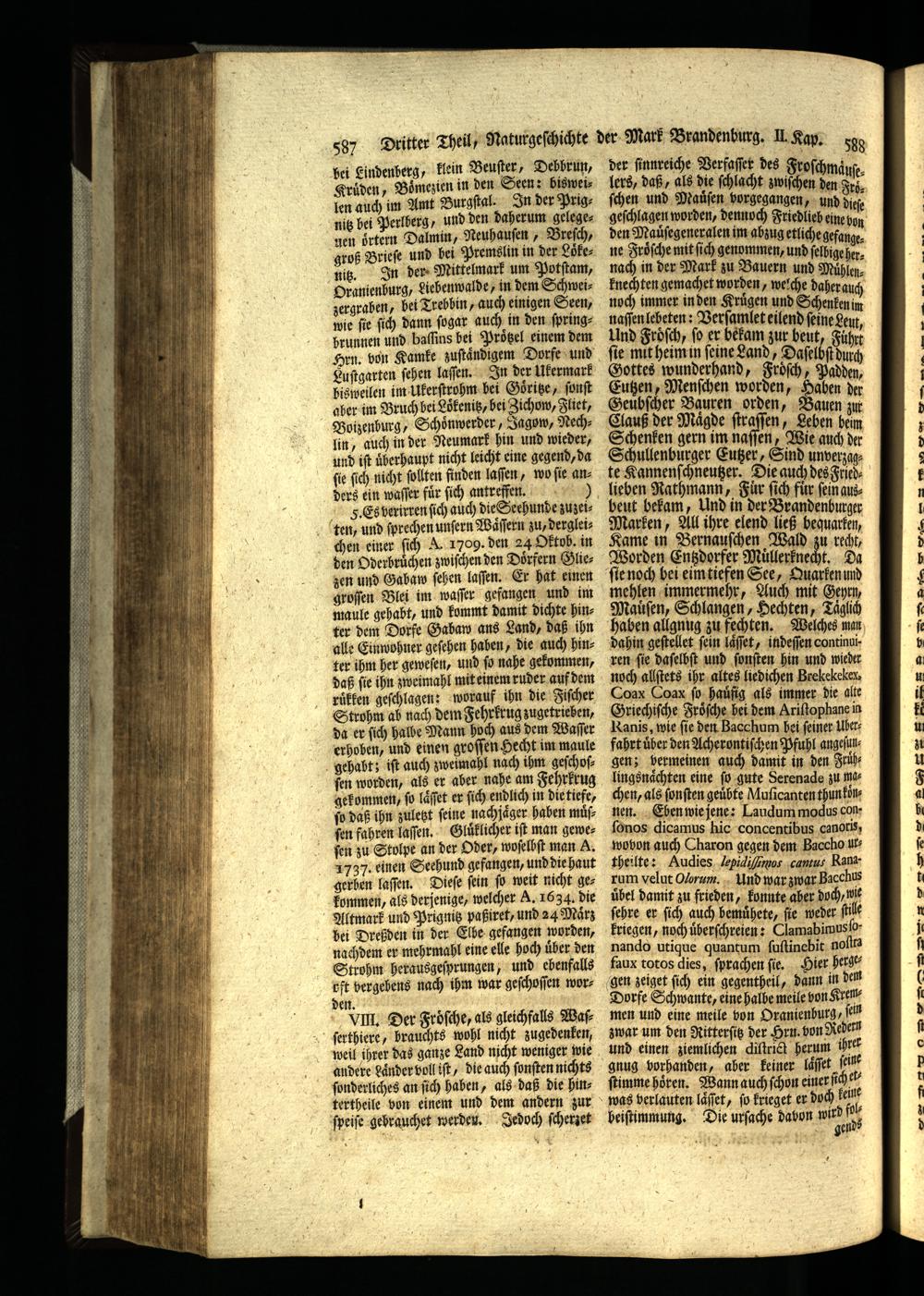 VIII. Der Froͤſche, als gleichfalls Waſſerthiere, brauchts wohl nicht zugedenken, weil ihrer das ganze Land nicht weniger wie andere Laͤnder voll iſt, die auch ſonſten nichts ſonderliches an ſich haben, als daß die hintertheile von einem und dem andern zur ſpeiſe gehrauchet werden. Jedoch ſcherzet