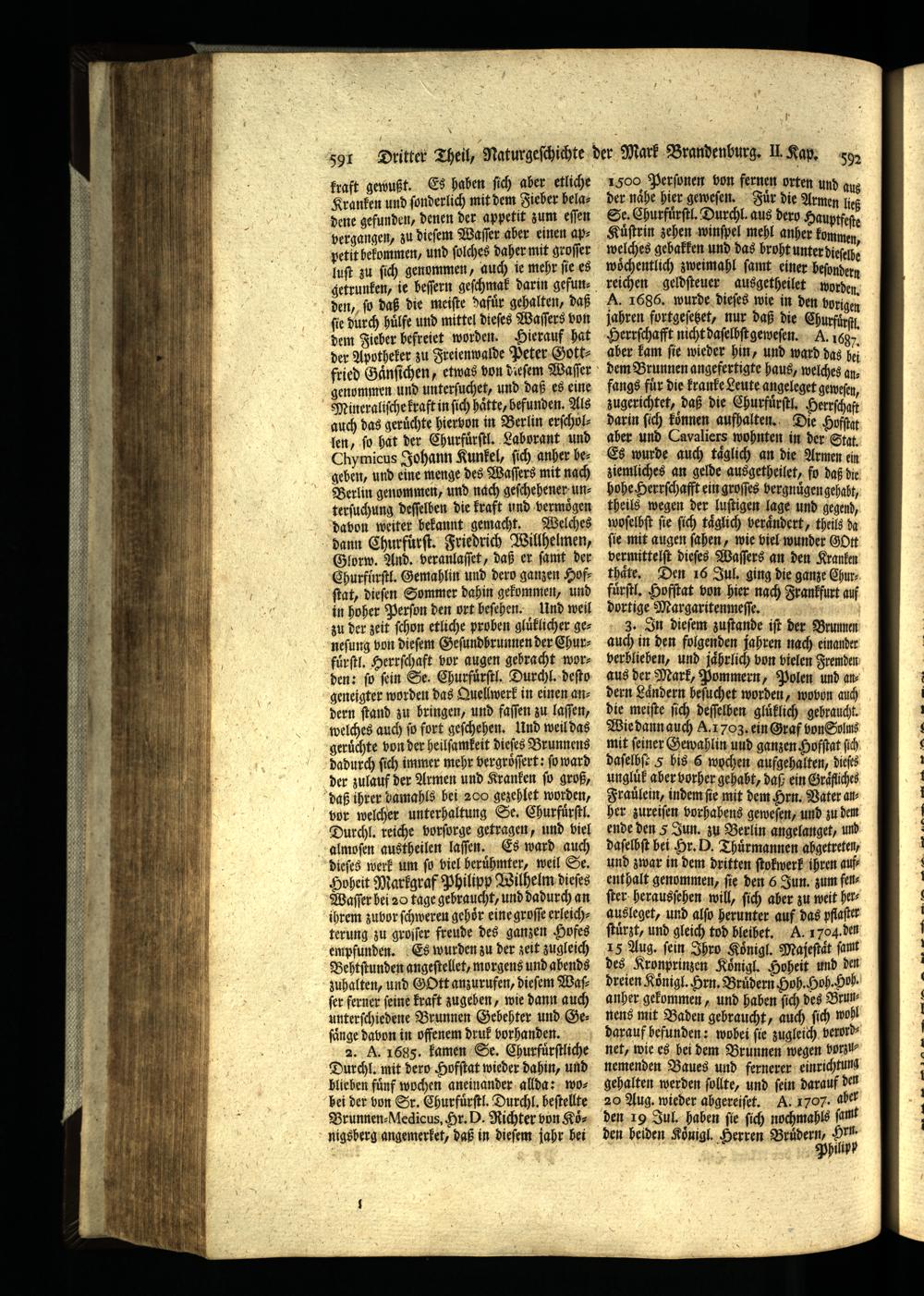 2. A. 16985. kamen Se. Churfuͤrſtliche Durchl. mit dero Hofſtat wieder dahin, und blieben fünf wochen aneinander allda: wobei der hon Sr. Churfuͤrſtl. Durchl. beſtellte Brunnen⸗ Medicus, Hr. D. Richter von Koͤnigsherg angemerket, daß in dieſem jahr hei