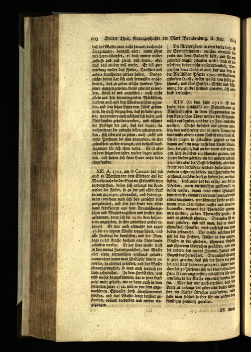 XIII. A. 1711. am O Cantate hat ſich auch zu Werben vor dem Elbthore auf der Marſche nahe bei der Stat ein Geſundbrunn hervorgethan, deſſen ſich anfangs die Leute wieder die Fieber, ſo zu der zeit allda ſtark herum gegangen, gebrauchet, und davon geneſen: welchem nach ſich das geruͤchte bald ausgebreitet, und fein viel Leute von allerhand krankheiten aus dem Braunſchweigiſchen und Magdeburgiſchen und ſonſten hin