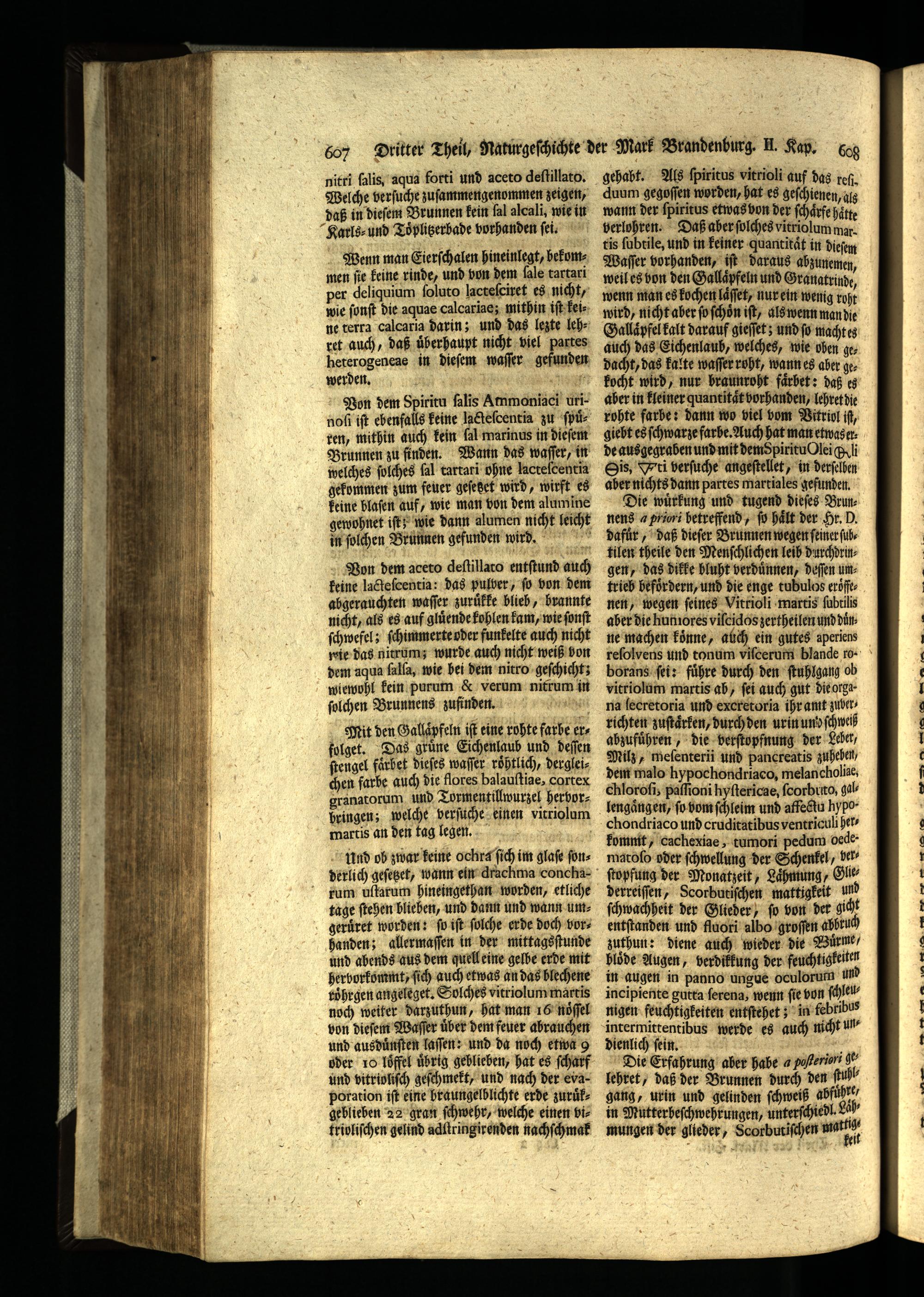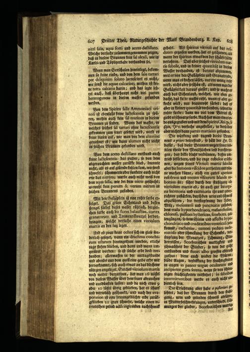 Wenn man Eierſchalen hineinlegt, hekommen fie keine rinde, und von dem ſale tartari per deliquium ſoluto lacteſciret es nicht, wie ſonſt die aquae calcariae; mithin iſt keine terra calcaria darin; und das lezte lehret auch, daß uͤberhaupt nicht viel partes heterogeneae in dieſem waſſer gefunden werden. ö. Von dem Spiritu ſalis Aàmmoniaci urino iſt ebenfalls keine lacteſcentia zu ſpiren, mithin auch kein ſal marinus in dieſem Brunnen zu finden. Wann das waſſer, in welches ſolches ſal tartari ohne lacteſcentia gekommen zum feuer geſetzet wird, wirft es
