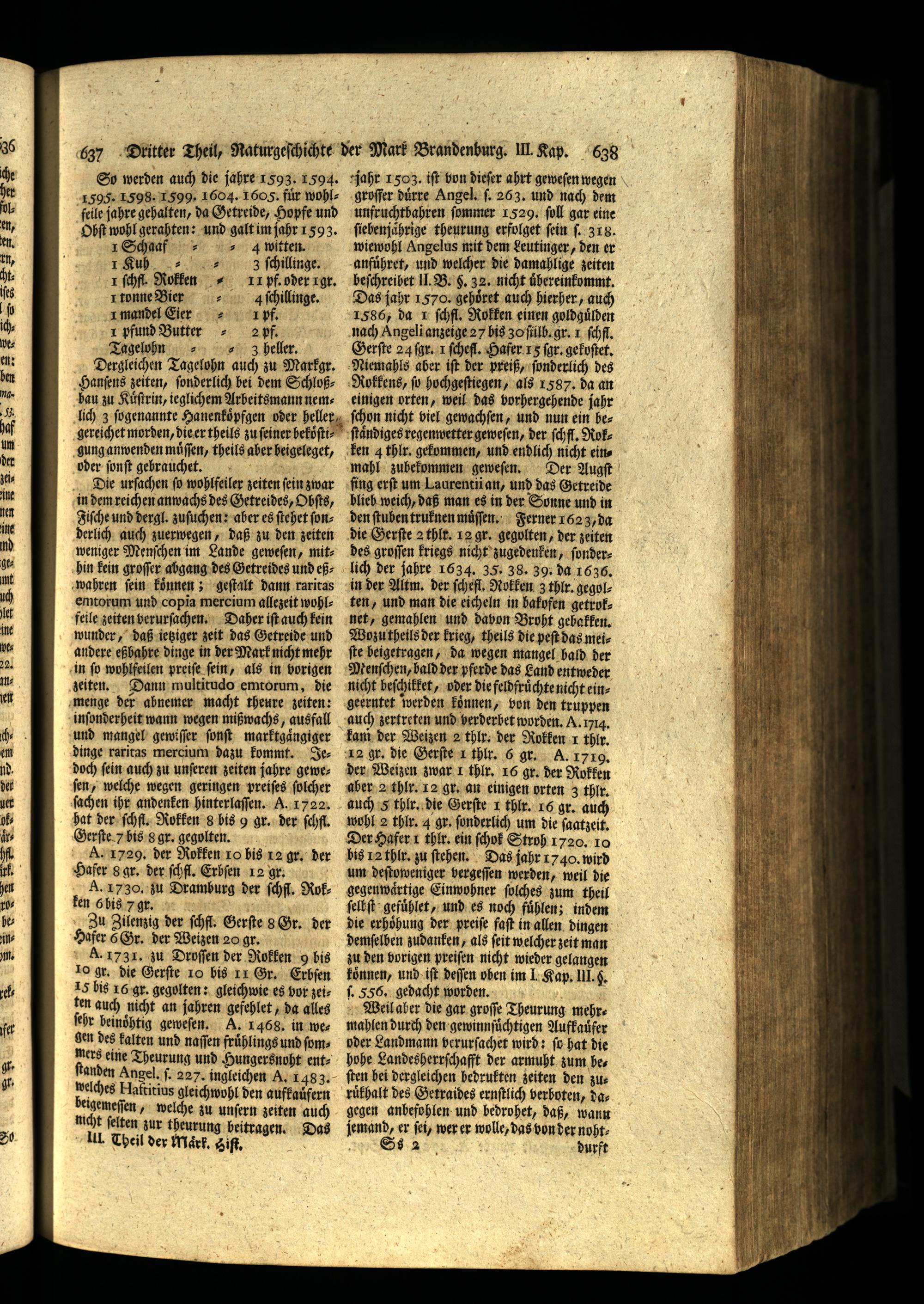 A. 1731. zu Droſſen der Rokken 9 bis 10 gr. die Gerſte 10 bis 11 Gr. Erbſen 15 bis 16 gr. gegolten: gleichwie es vor zeiten auch nicht an jahren geſehlet, da alles ſehr beinoͤhtig geweſen. A. 1468. in we— gen des kalten und naſſen fruͤhlings und ſommers eine Theurung und Hungersnoht entſtanden Angel. ſ. 227. ingleichen A. 1483. welches Haftitius gleichwohl den aufkauͤfern beigemeſſen, welche zu unſern zeiten auch nicht ſelten zur theurung beitragen. Das Ul. Theil der Maͤrt. gif,|