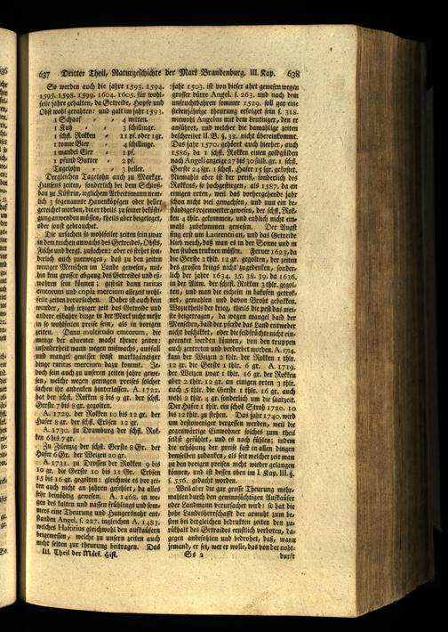 kam der Weizen 2 thlr; der Rolken 1 thlr. 12 gr. die Gerſte 1 thlr. 6 gr. A. 1719. der Weizen zwar 1 thlr. 16 gr. der Rokken aber 2 thlr. 12 gr. an einigen orten 3 thlr. auch 6 thlr. die Gerſte x thlr. 16 gr. auch wohl 2 thlr. 4 gr. ſonderlich um die ſaatzeit. Der Hafer 1 thlr. ein(hot Stroh 1720. 10 bis 12 thlr. zu ſtehen. Das jahr 1740. wird um deſtoweniger vergeſſen werden, weil die gegenwaͤrtige Einwohner ſolches zum theil ſelbſt gefuuͤhlet, und es noch fühlen; indem die erhoͤhung der preiſe faſt in allen dingen demſelben zudanken, als ſeit welcher zeit man zu den vorigen preiſen nicht wieder gelangen koͤnnen, und iſt deſſen oben im 1 Kap. III. 5. ſ. 556. gedacht worden. Weil aber die gar groſſe Theurung mehr. mahlen durch den gewinnſuͤchtigen Aufkauͤfer oder Landmann verurſachet wird: ſo hat die hohe Landesherrſchafft der armuht zum heſten bei dergleichen hedrukten zeiten den zuruͤkhalt des Getraides ernſtlich verboten, dar gegen anbefohlen und bedrohet, daß, wann jemand, er ſei, wer er wolle, das von der nohtn ,, durft