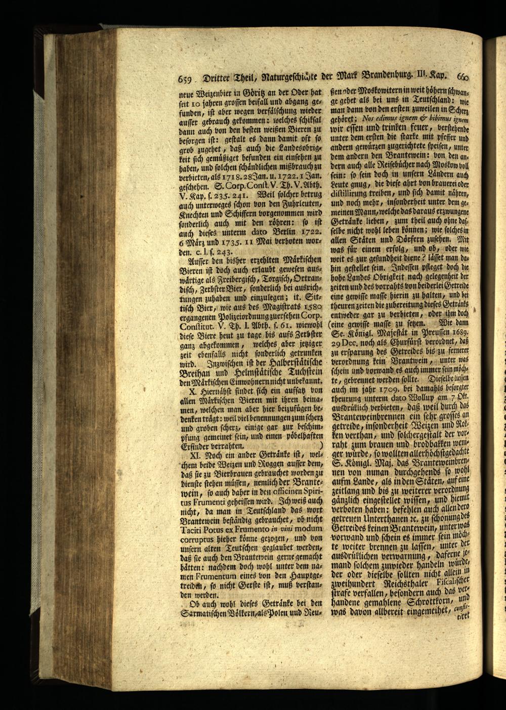 X. Hiernaͤhſt ſindet ſich ein aufſatz von allen Maͤrkiſchen Bieren mit ihren beinamen, welchen man aber hier beizufügen be: denken traͤgt: weil viel benennungen zum ſcherz und groben ſcherz, einige gar zur beſchimpfung gemeinet ſein, und einen poͤbelhaften Erfinder verrahten.. XI. Noch ein ander Getränke iſt, welchem beide Weizen und Roggen auſſer dem, daß fie zu Bierbrauen gebrauchet worden zu bienſte ſtehen muͤſſen, nemlich der Brantewein, ſo auch daher in den officinen Spiritus Frumenti geheiſſen wird. Ich weiß auch nicht, da man in Teutſchland das wort Brantemein beſtaͤndig gehrauchet, oh nicht Faciti Potus ex Frumento in vini, modum corruptus hieher koͤnne gezogen, und von unſern alten Teutſchen geglaubet werden, daß fie auch den Brantewein gerne gemacht hätten: nachdem doch wohl unter dem namen Frumentum eines von den Hauptgetreiden, ſo nicht Gerſte iſt, muß verſtanden werden.