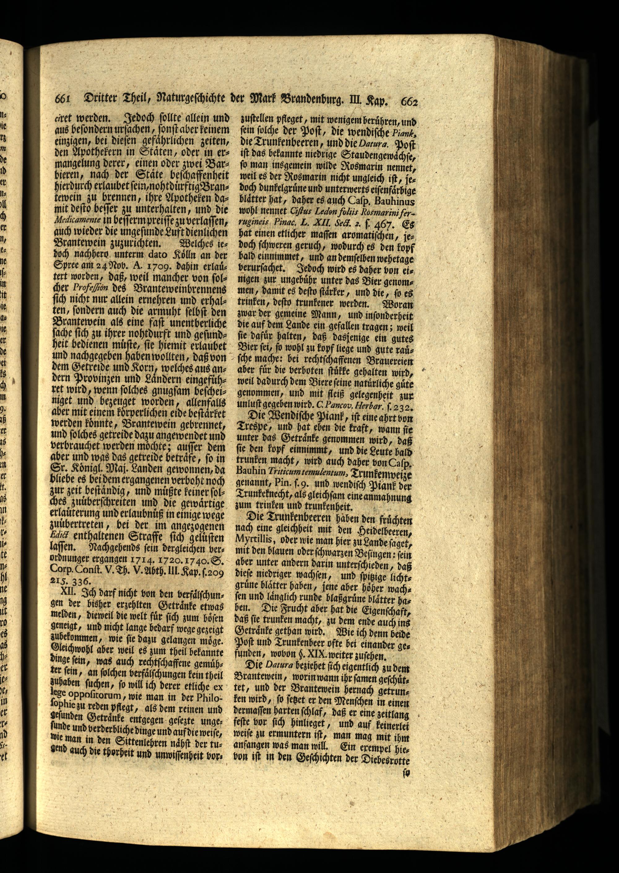 dem Getreide und Korn, welches aus andern Provinzen und Laͤndern eingefuͤhret wird, wenn ſolches gnugſam beſcheiniget und bezeuget worden, allenfalls aber mit einem koͤrperlichen eide heſtaͤrket werden koͤnnte, Brantewein gebrennet, und ſolches getreide dazu angewendet und verbrauchet werden möchte; auſſer dem aber und was das getreide betraͤfe, ſo in Sr. Koͤnigl. Maj. Landen gewonnen, da bliebe es bei dem ergangenen verhoht noch zur zeit beſtaͤndig, und müßte keiner ſolches zuüberſchreiten und die gewaͤrtige erlauͤterung und erlaubnuͤß in einige wege zuuͤbertreten, bei der im angezogenen Edi? enthaltenen Straffe ſich gelüſten laſſen. Nachgehends fein dergleichen herordnunger ergangen 1714. 1720. 1740. S. Corp. Conſt. V. Th. V. Abth. lll. Kap. f.209 215. 336. XII. Ich darf nicht won den derfaͤlſchungen der bisher erzehlten Getraͤnke etwas melden, dieweil die welt für ſich zum böſen geneigt, und nicht lange bedarf wege gezeigt zubekommen, wie fie dazu gelangen moͤge. Gleichwohl aber weil es zum theil bekannte dinge fein, was auch rechtſchaffene gemühter ſein, an ſolchen berfaͤſſchungen kein theil zuhaben ſuchen, fo w ill ich derer etliche ex ge oppoſitorum, wie man in der Philoophie zu reden pflegt, als dem reinen und geſunden Getraͤnke entgegen geſezte ungeſunde und verderbliche dinge und auf die weiſe, wie man in den Sittenlehren naͤhſt der tu= end auch die thorheit und unwiſſen heit bor.